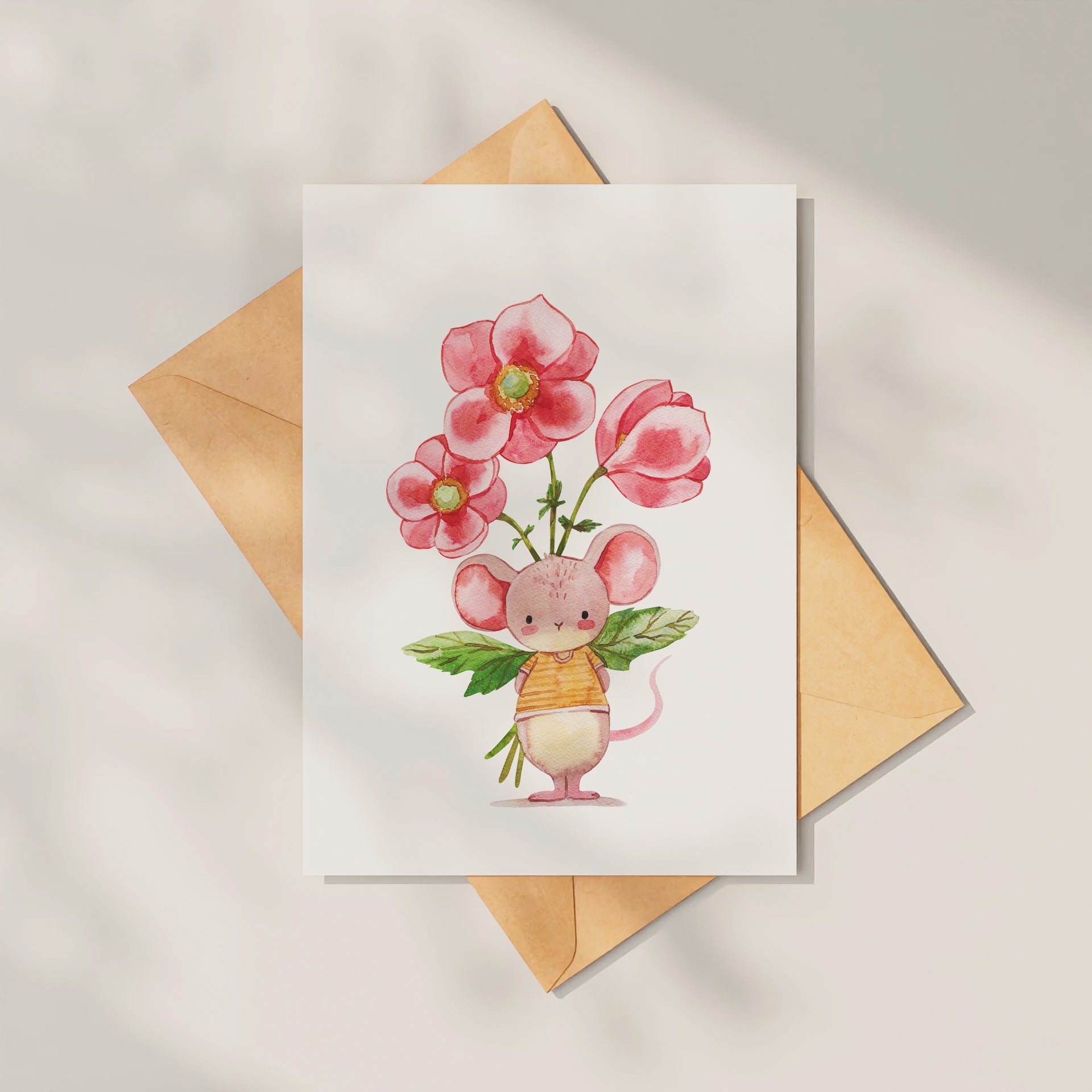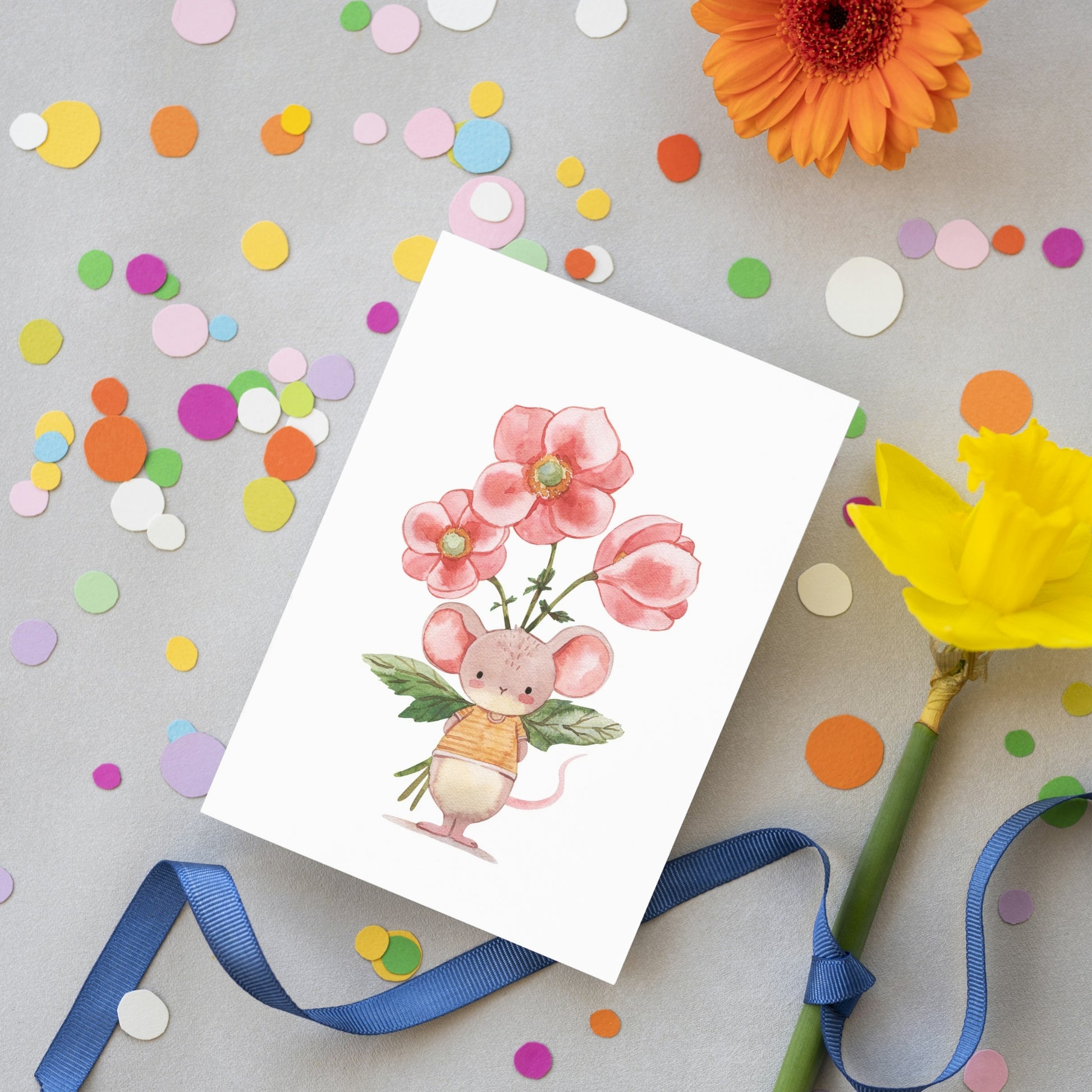 Liebevoll gestaltete Postkarte mit süßem Mausmotiv. Perfekt als Glückwunschkarte, zur Gratulation, als Dankeschön oder für liebe Grüße.