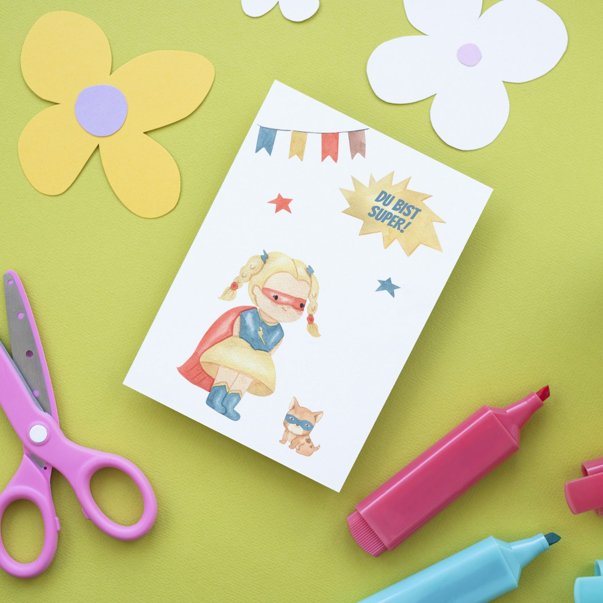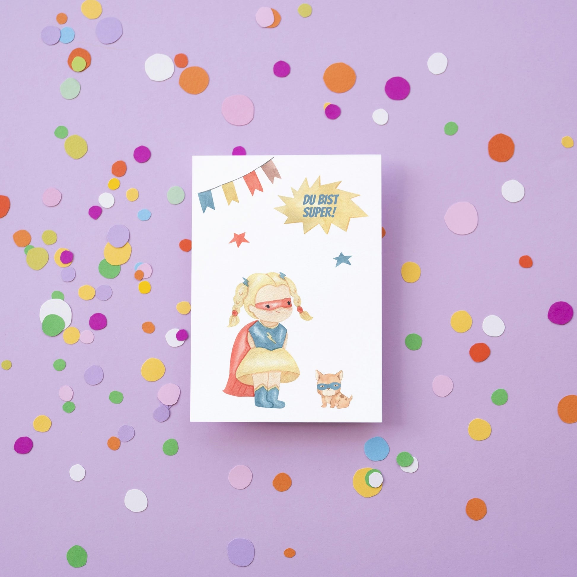 Diese liebevoll gestaltete Supergirl Postkarte ist perfekt als Glückwunschkarte zum Geburtstag, zur Motivation, zur Aufmunterung oder für liebe Grüße.