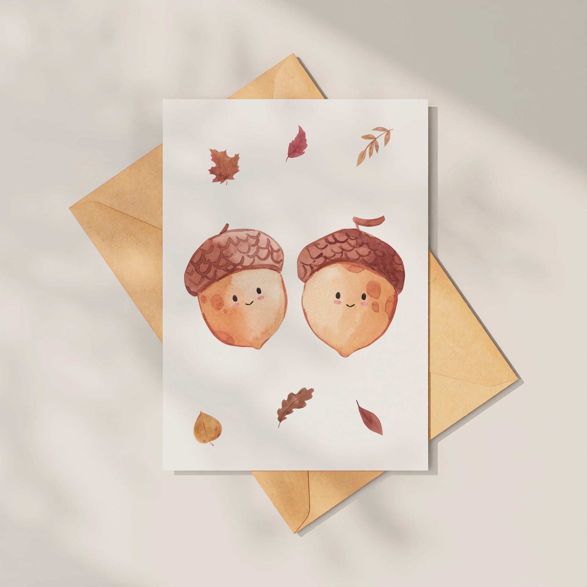 Liebevoll gestaltete Postkarte mit niedlichen Eicheln im Herbstlaub. Perfekt für liebe Grüße, als Glückwunschkarte, als Geschenk oder in einem Rahmen als Herbstdekoration für Kinder und Erwachsene.