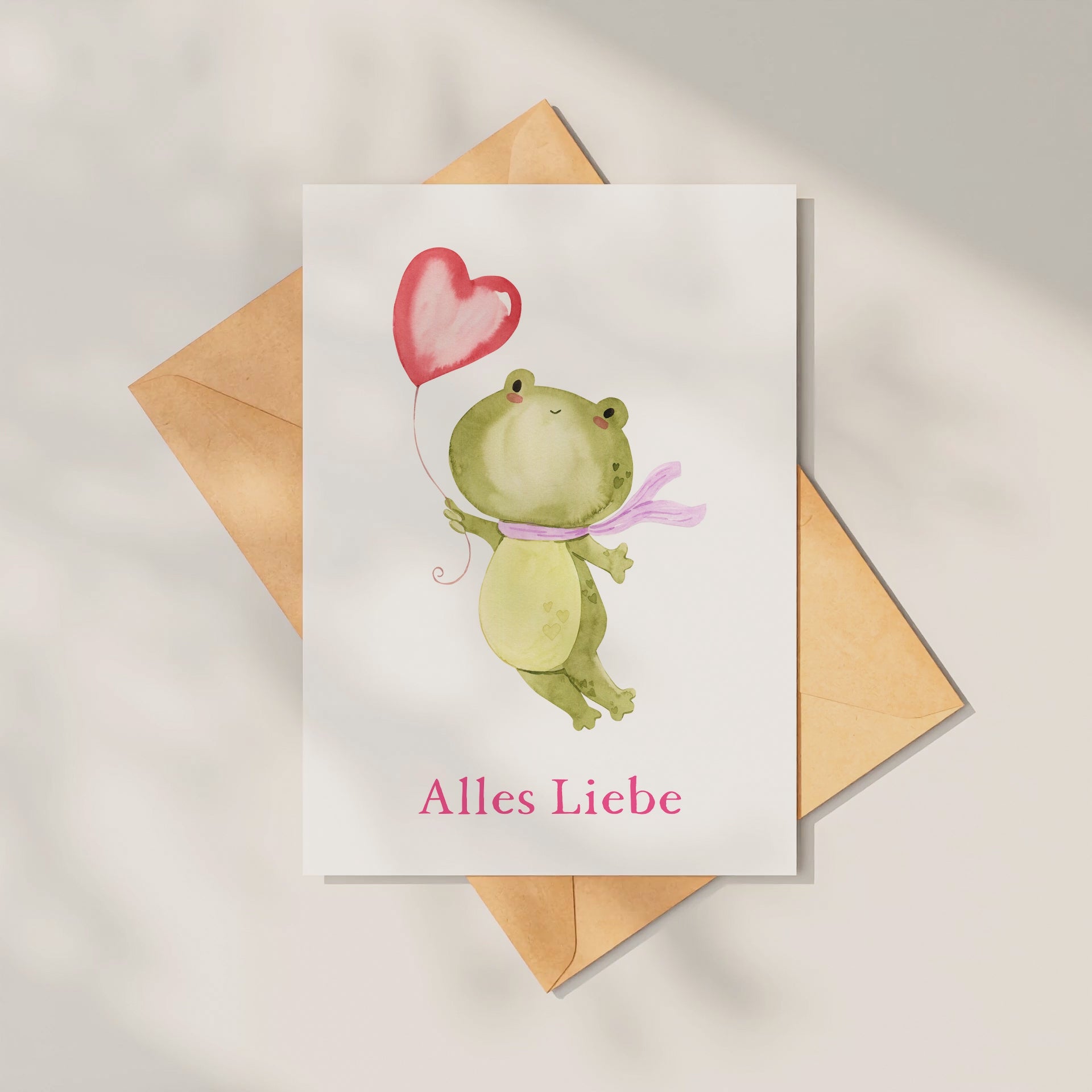 Liebevoll gestaltete Postkarte mit zauberhaftem Frosch-Motiv und "Alles Liebe" Schriftzug. Perfekt für liebe Grüße für die beste Freundin oder Liebelingsmenschen und als Glückwünsche zur Hochzeit oder Verlobung.
