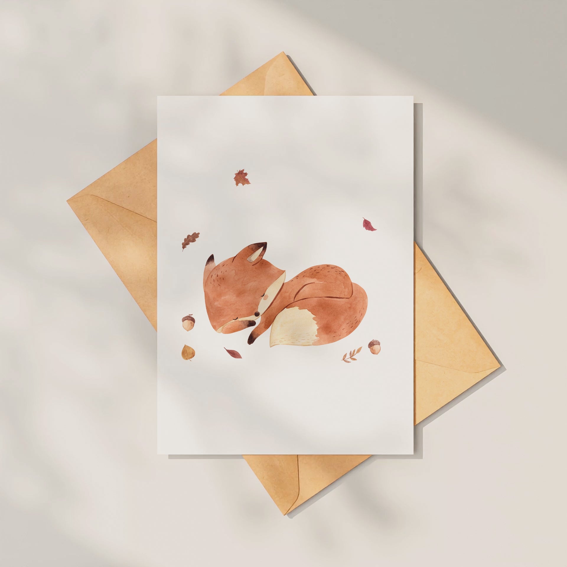 Liebevoll gestaltete Postkarte mit dem süßen, schlafenden Fuchs im Herbstlaub. Perfekt für liebe Grüße, als Glückwunschkarte, als Geschenk oder in einem Rahmen als Herbstdekoration für Kinder und Erwachsene.