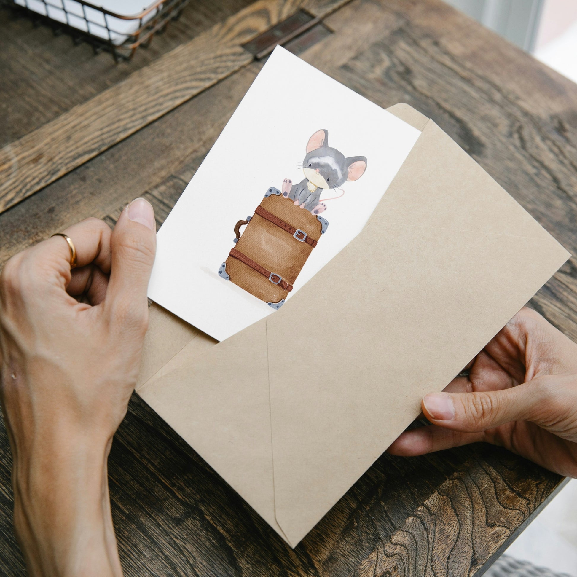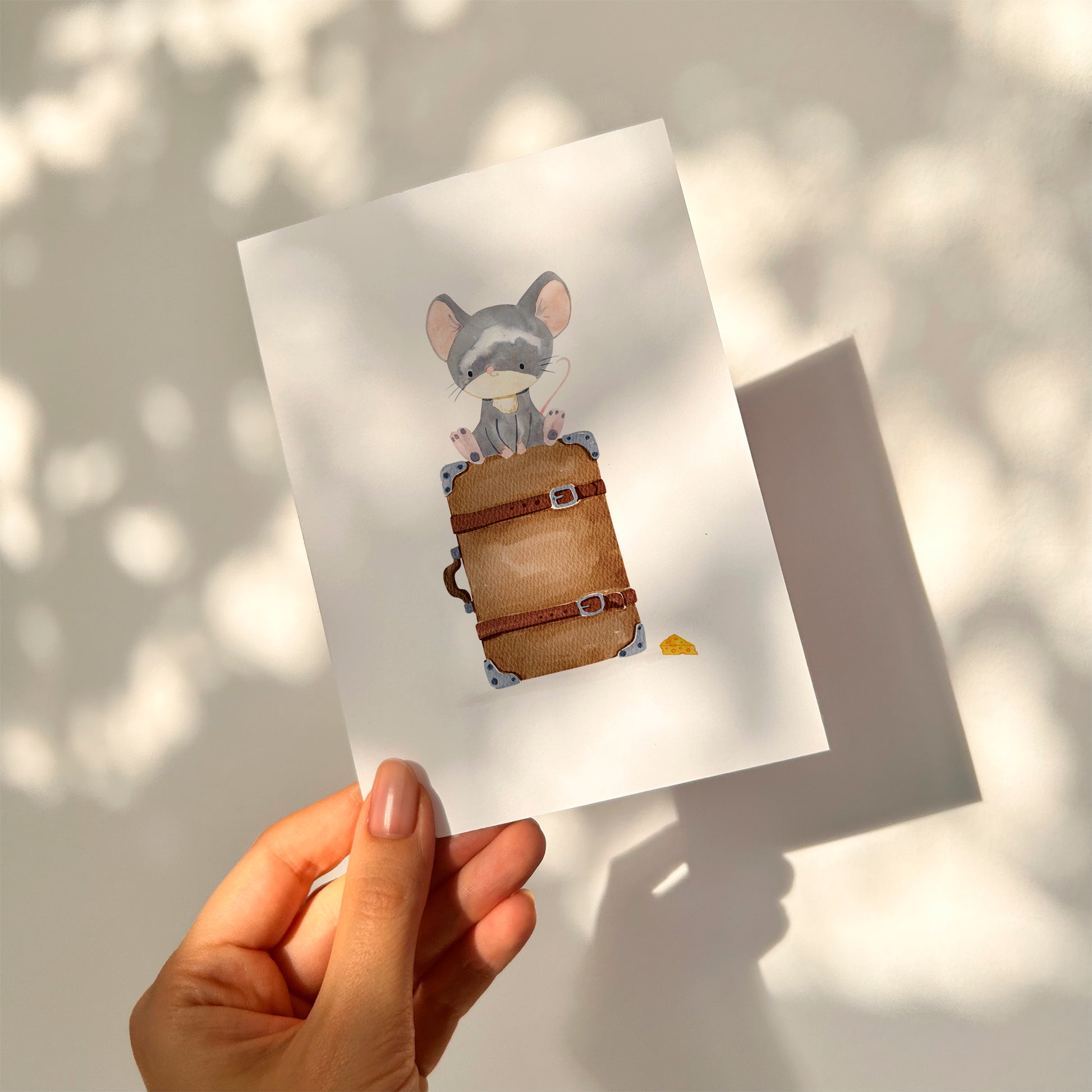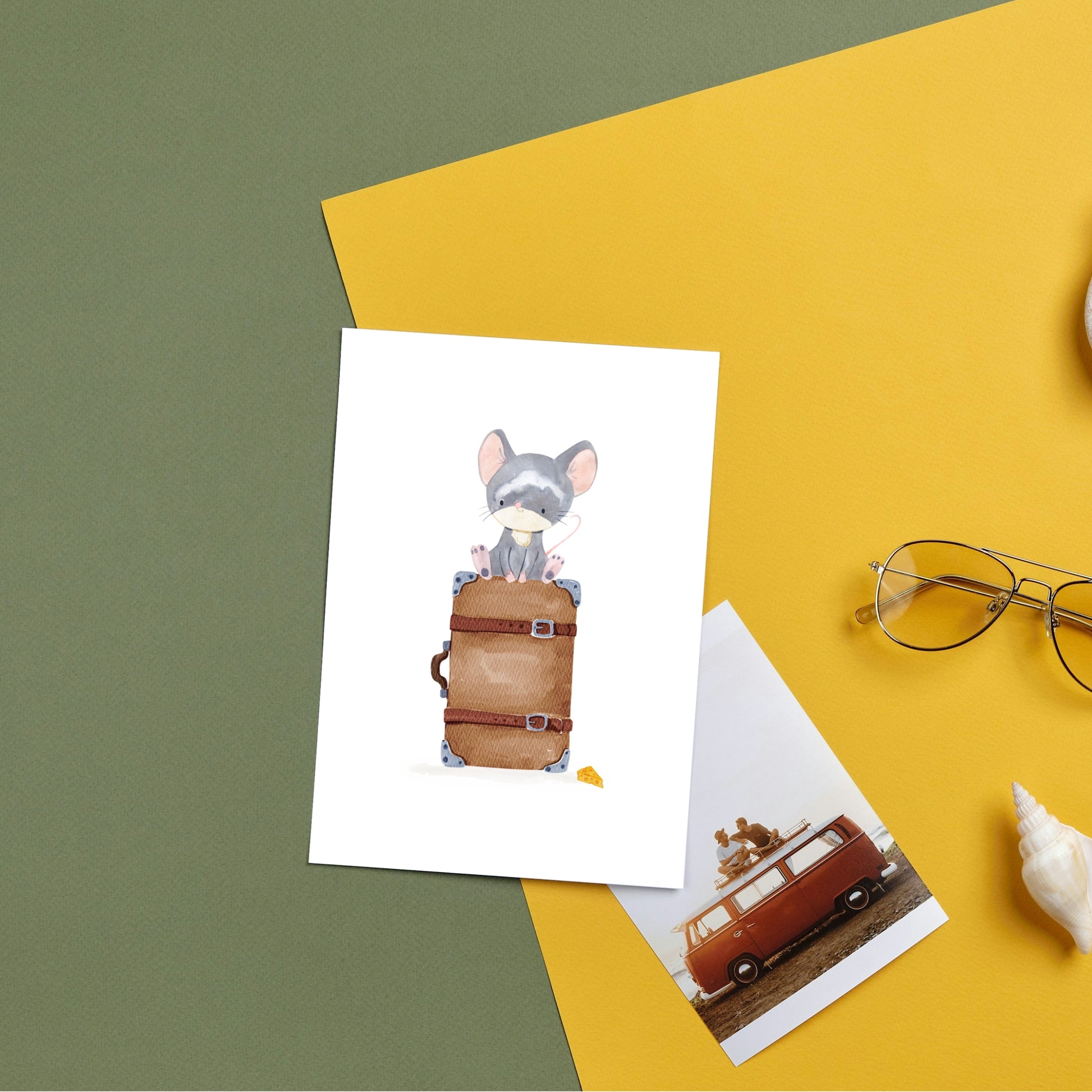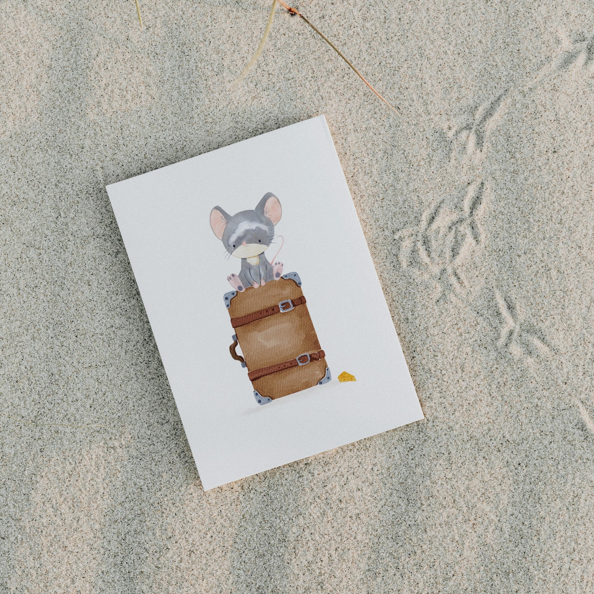 Liebevoll gestaltete Postkarte mit süßem Mausmotiv. Perfekt, um eine gute Reise zu wünschen, als Reisegutschein oder als Grußkarte für den Umzug oder die erste eigene Wohnung.