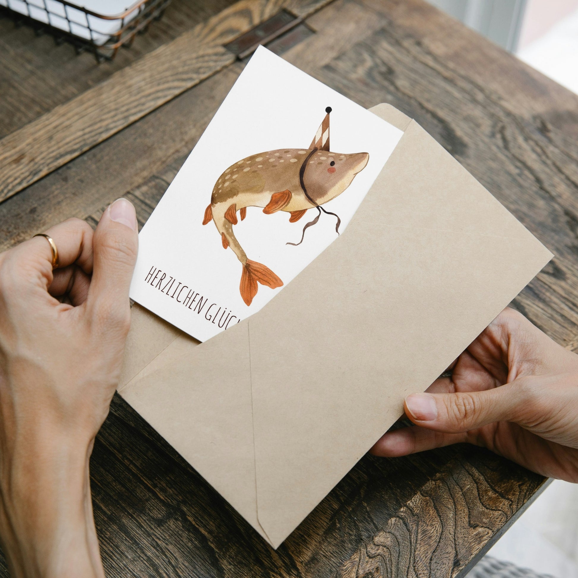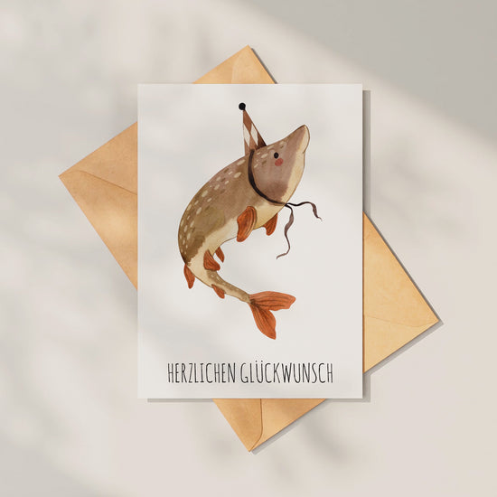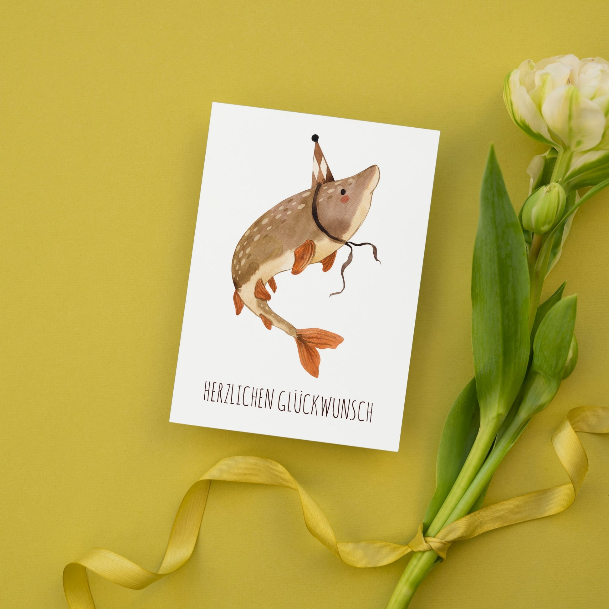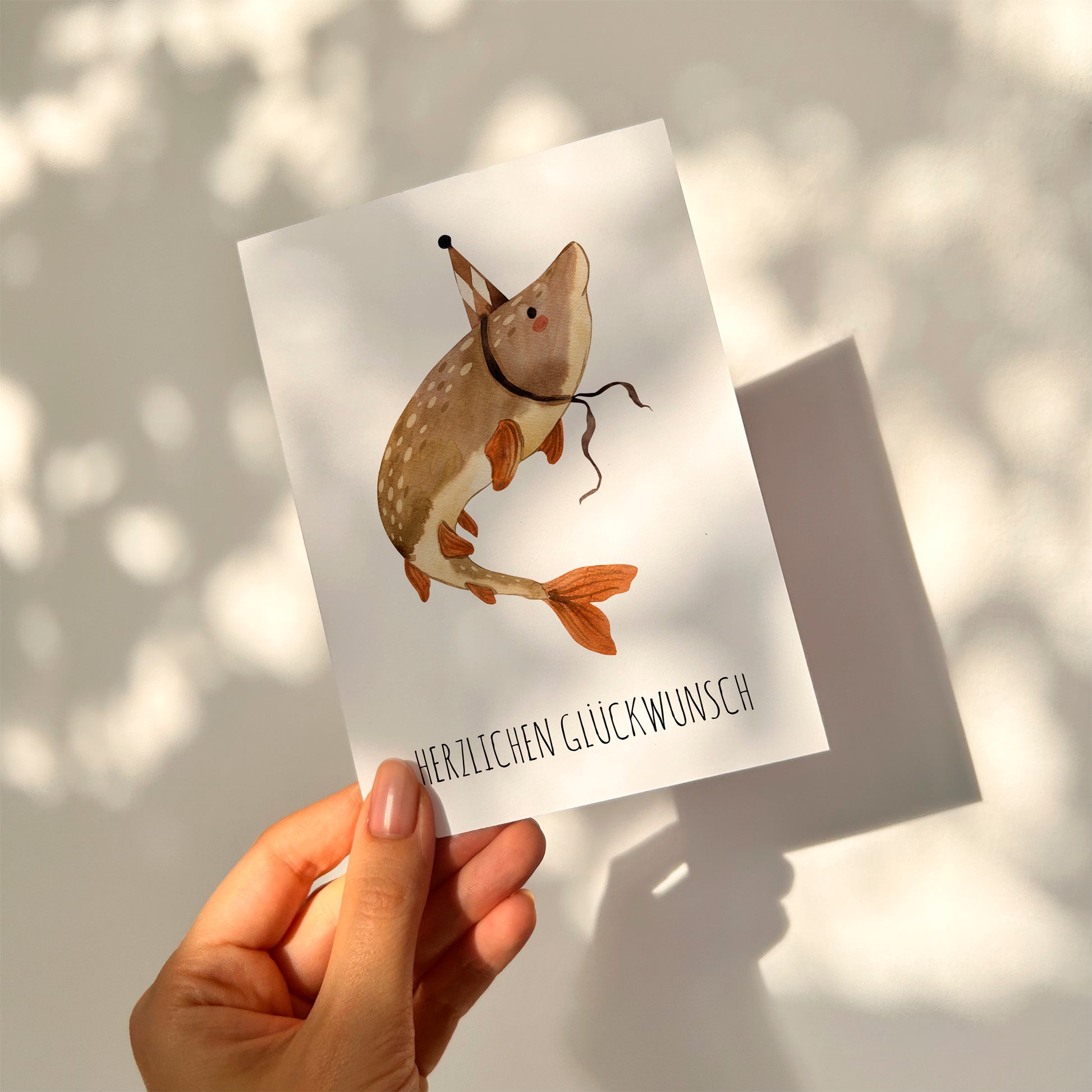 Liebevoll gestaltete Geburtstagskarte für Kinder mit niedlichem Fisch und 'Herzlichen Glückwunsch' Schriftzug, die garantiert ein Lächeln auf jedes Gesicht zaubert. Diese handgefertigte Karte ist als Glückwunschkarte zum Kindergeburtstag perfekt für kleine Geburtstagsstars, die Tiere lieben!