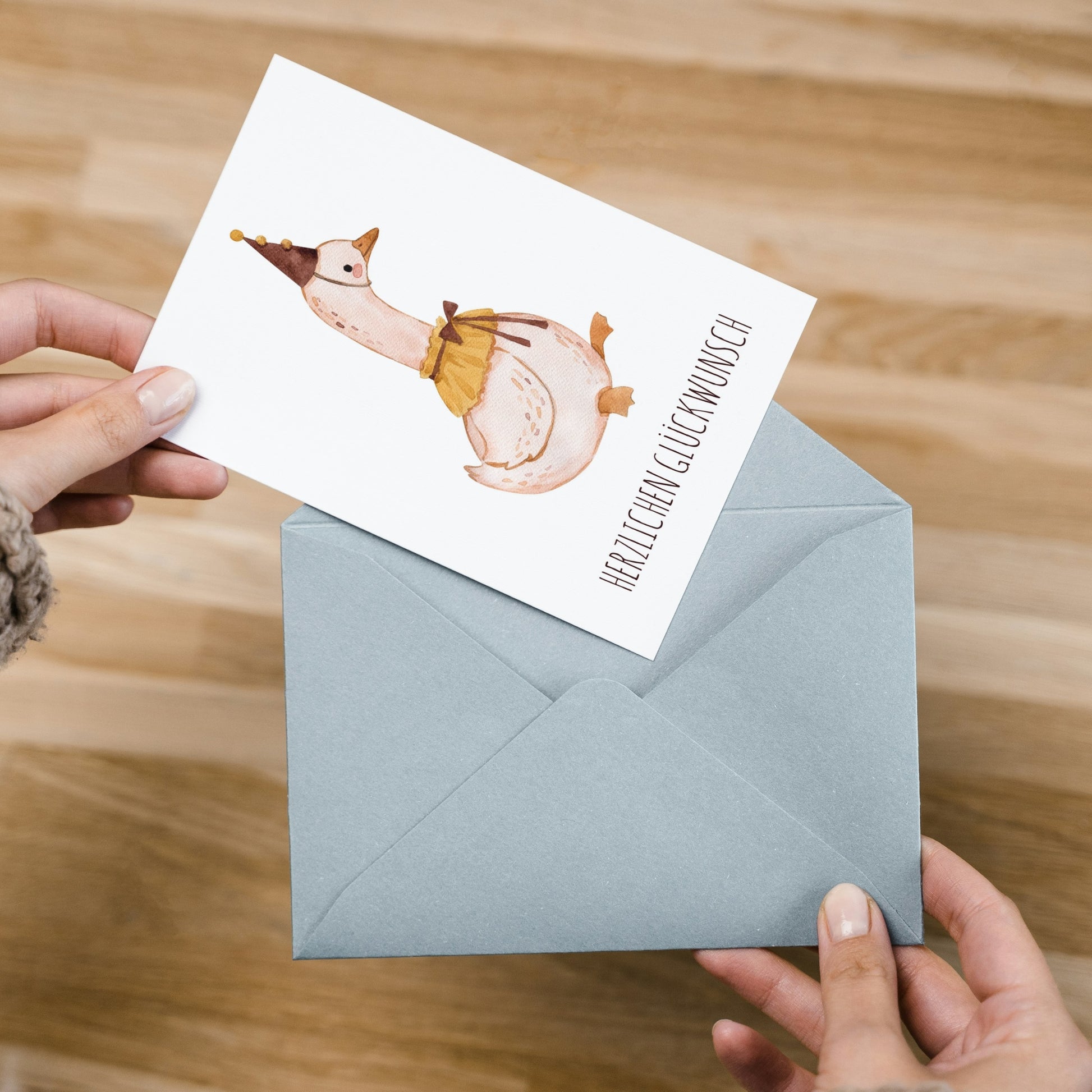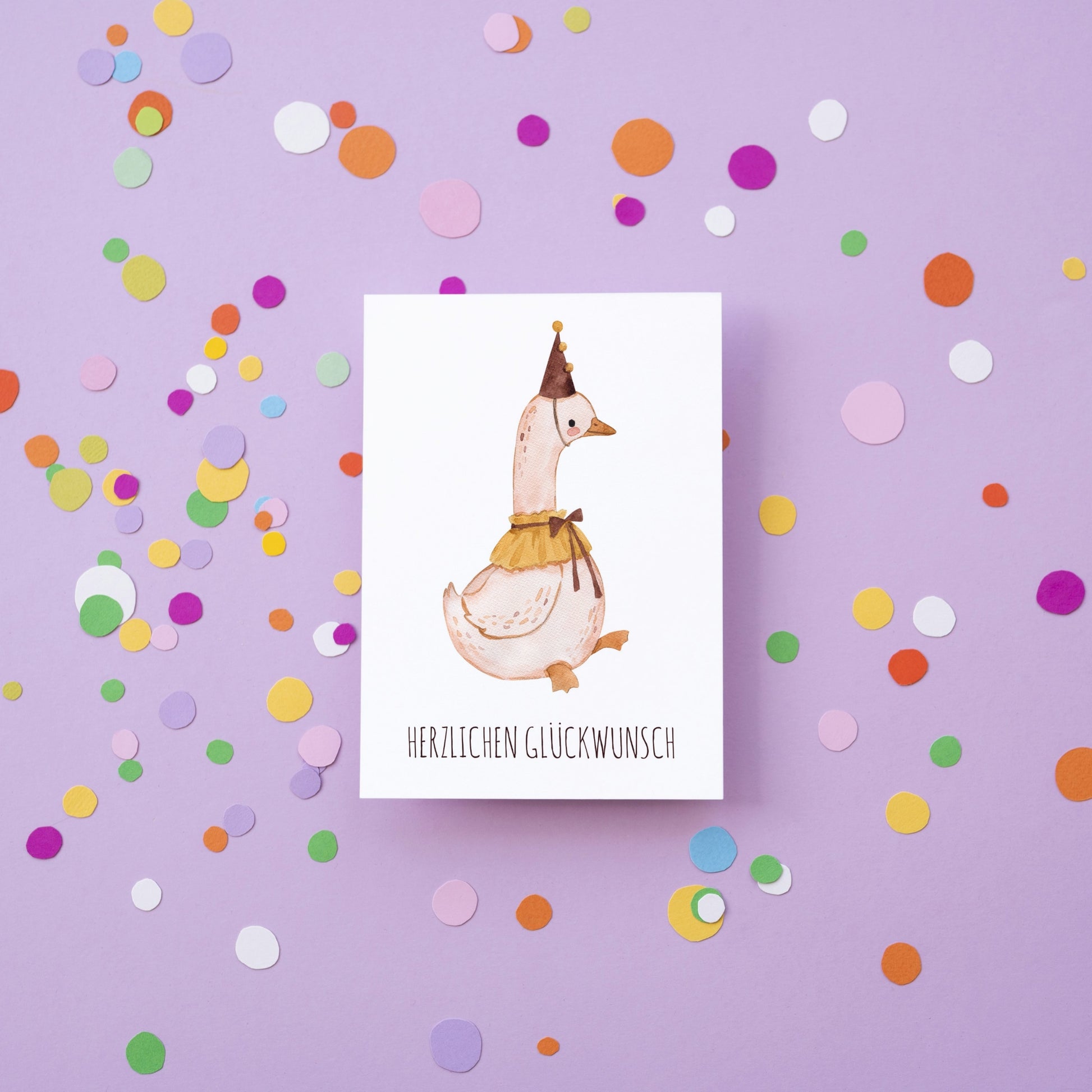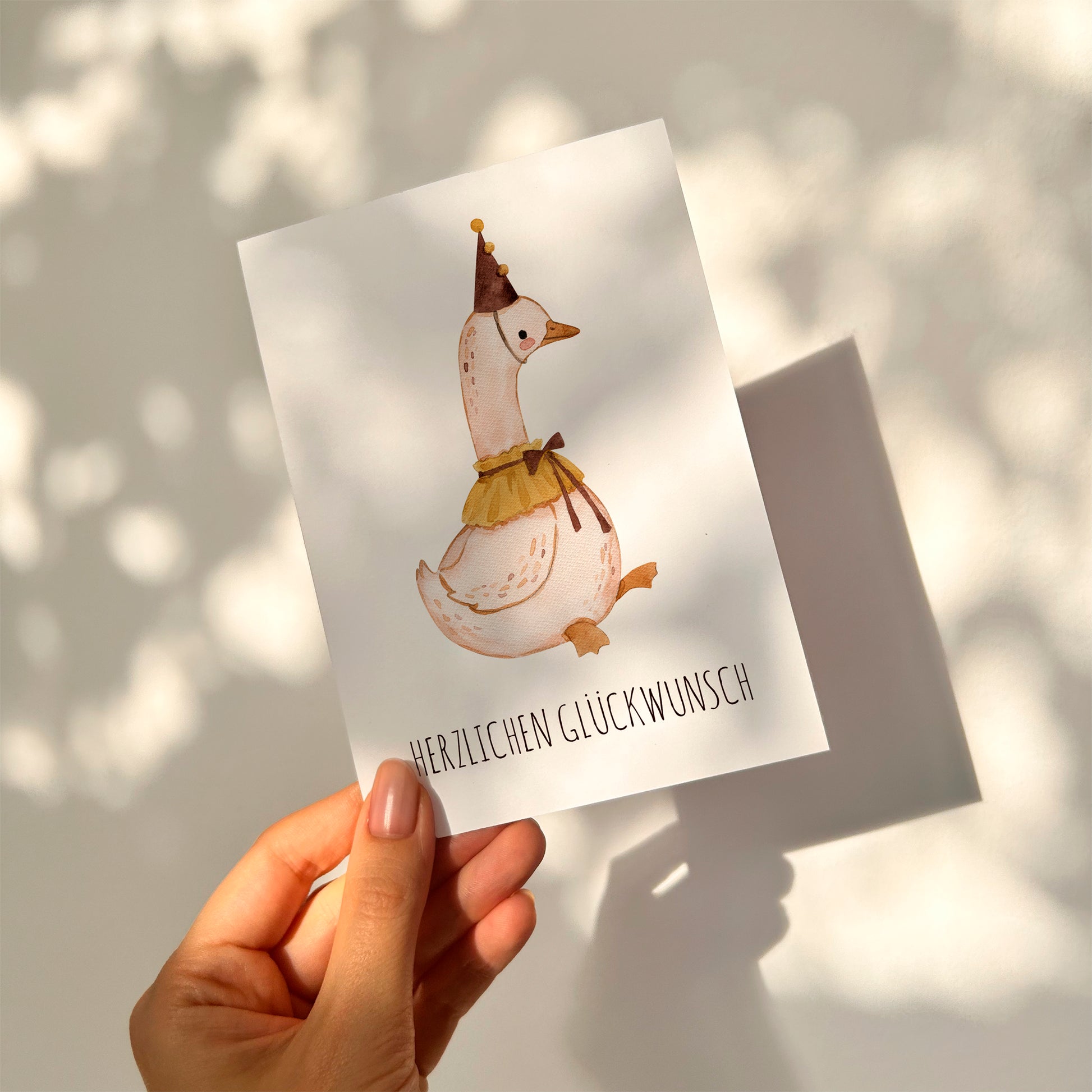 Liebevoll gestaltete Geburtstagskarte für Kinder mit niedlicher Gans und 'Herzlichen Glückwunsch' Schriftzug, die garantiert ein Lächeln auf jedes Gesicht zaubert. Diese handgefertigte Karte ist als Glückwunschkarte zum Kindergeburtstag perfekt für kleine Geburtstagsstars, die Tiere lieben!