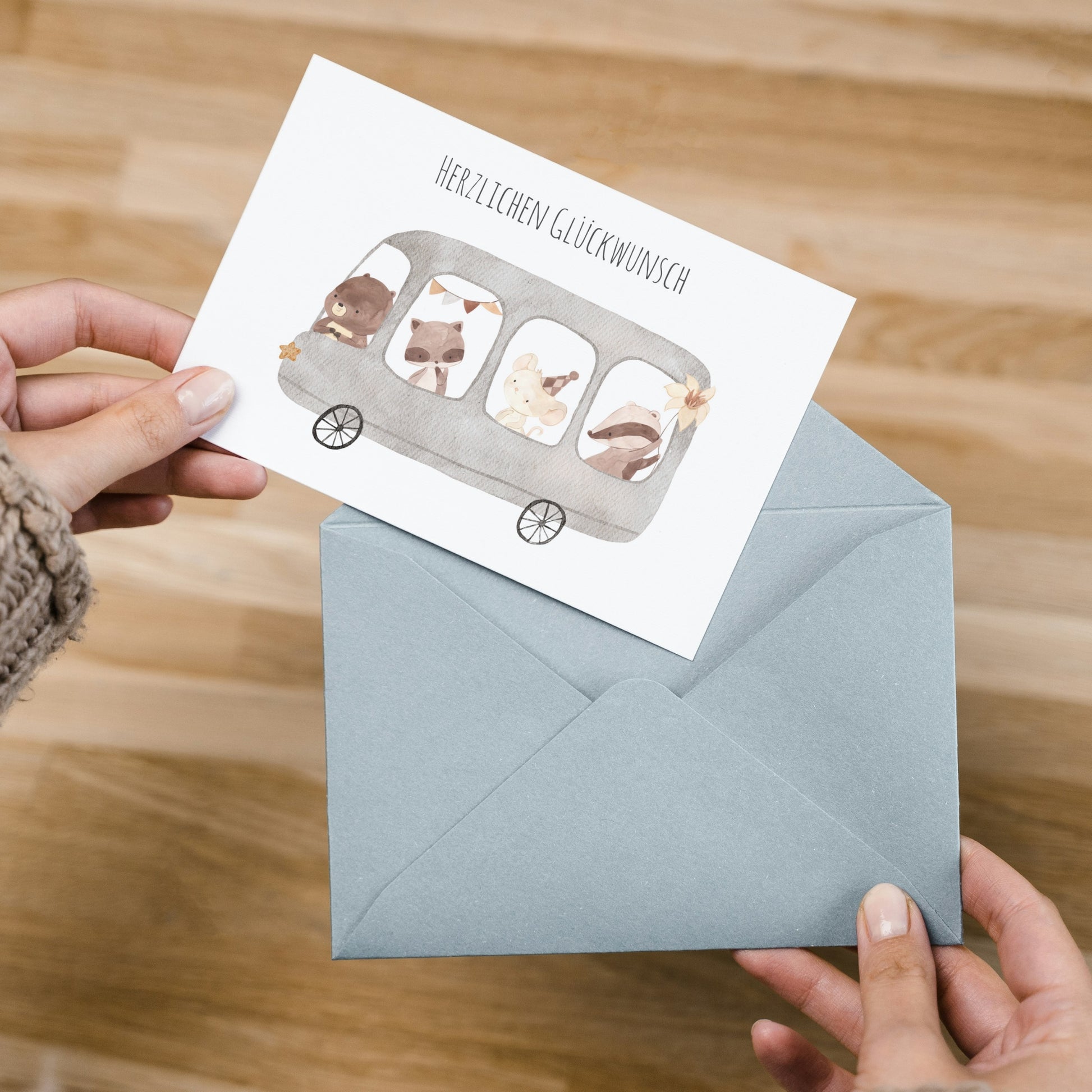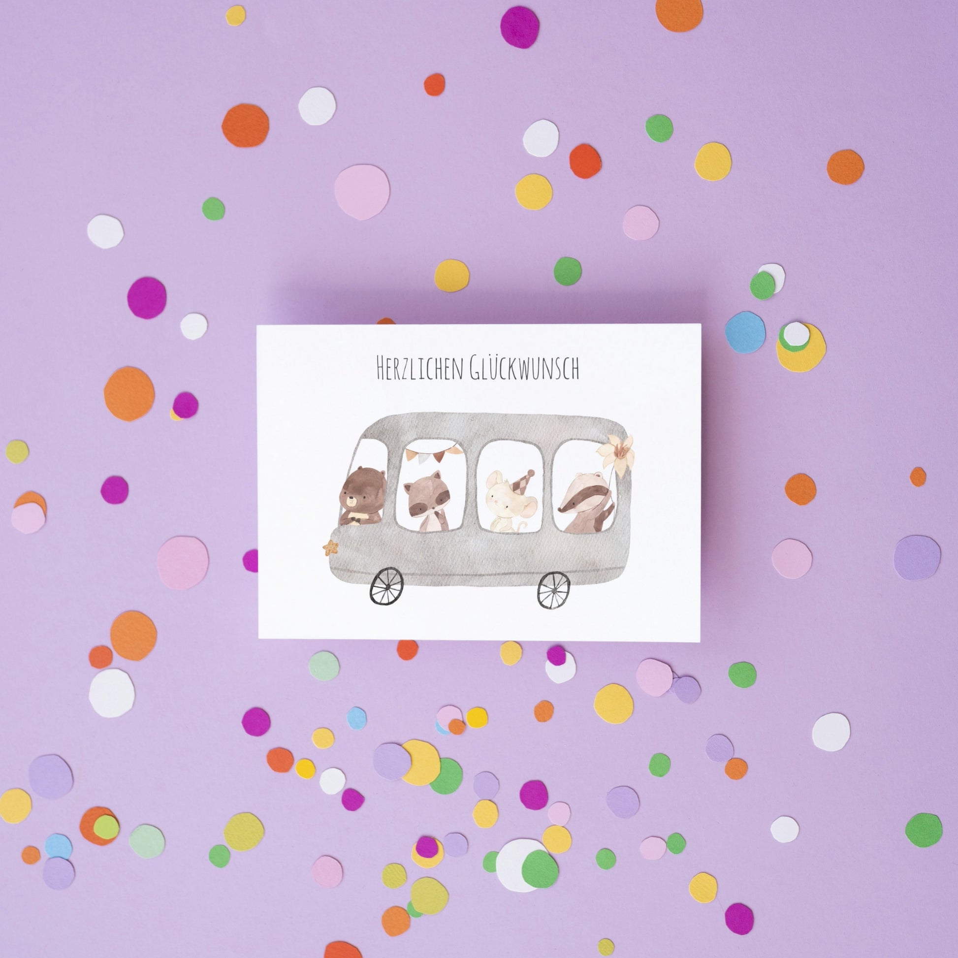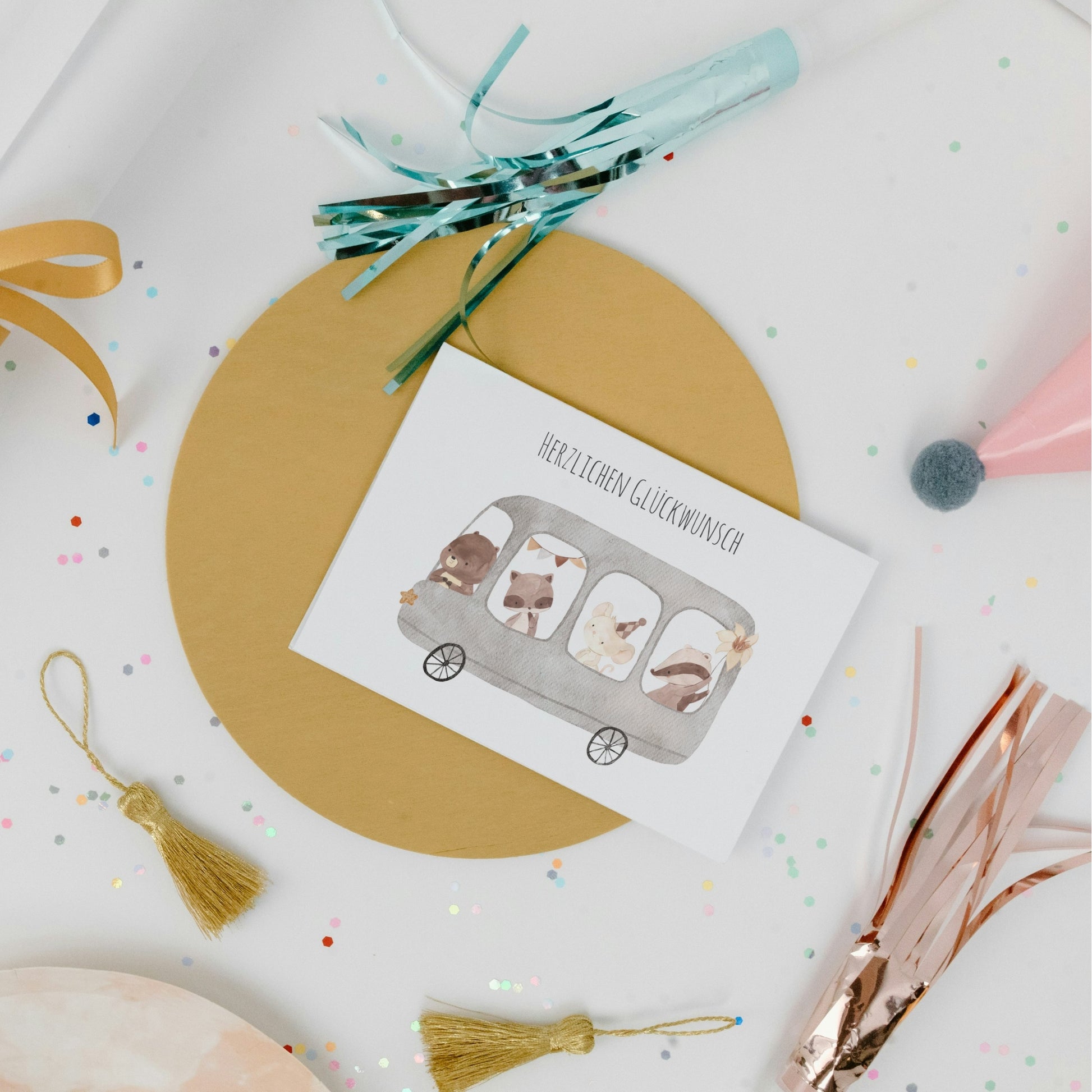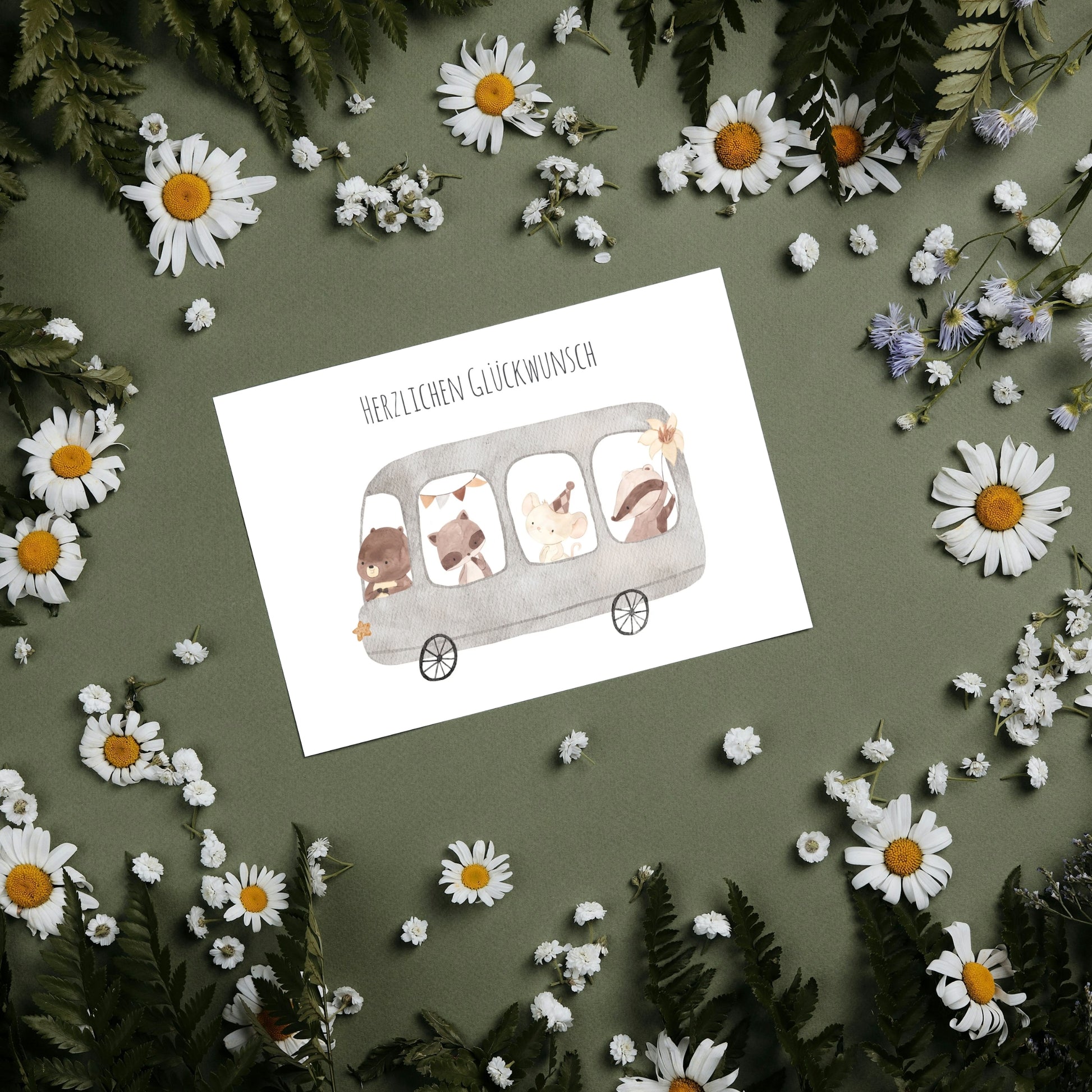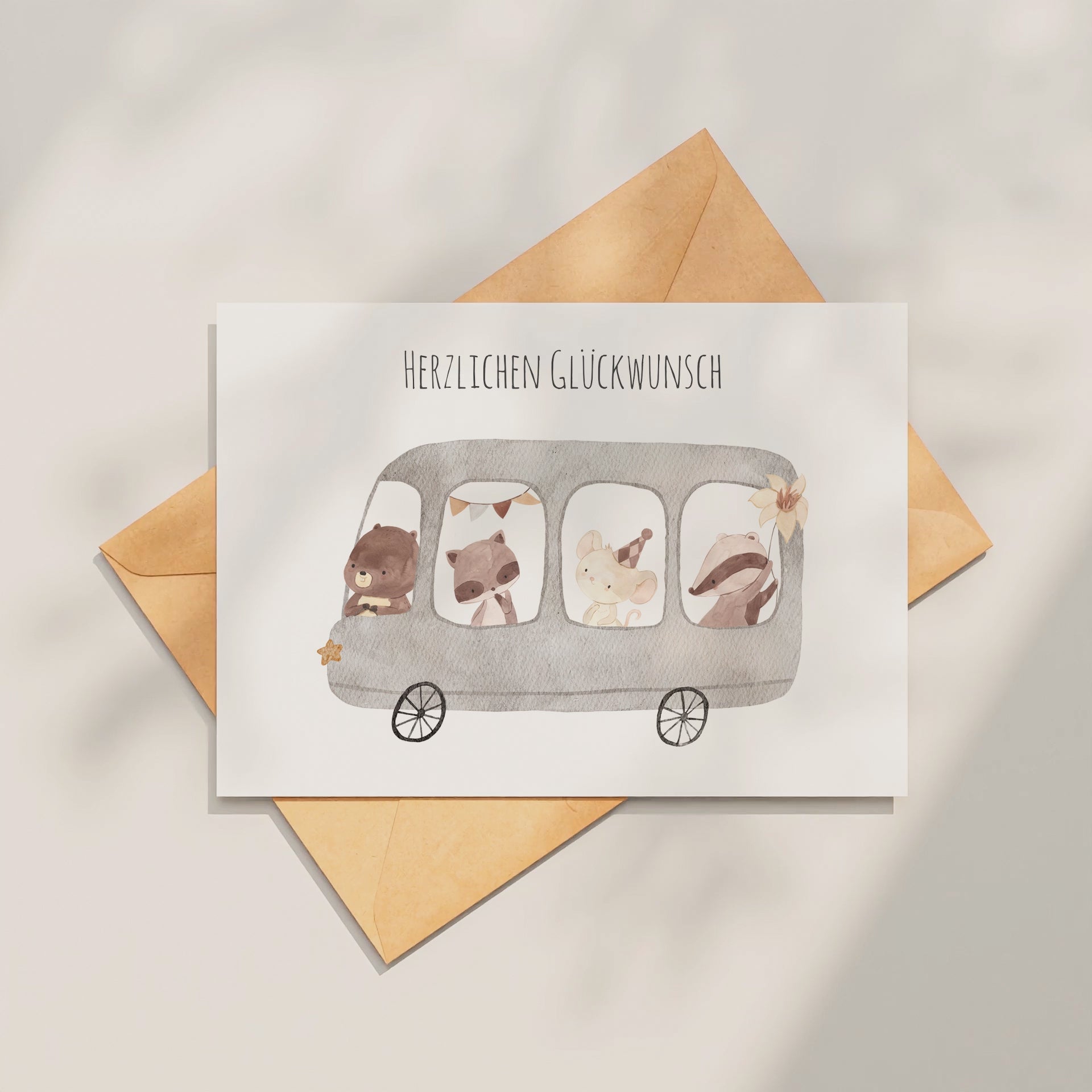 Liebevoll gestaltete Geburtstagskarte für Kinder mit niedlichem Bus mit den Waldtieren Biber, Waschbär, Maus und Dachs und 'Herzlichen Glückwunsch' Schriftzug. Diese handgefertigte Karte ist perfekt als Glückwunschkarte für kleine Geburtstagsstars, die Tiere lieben!