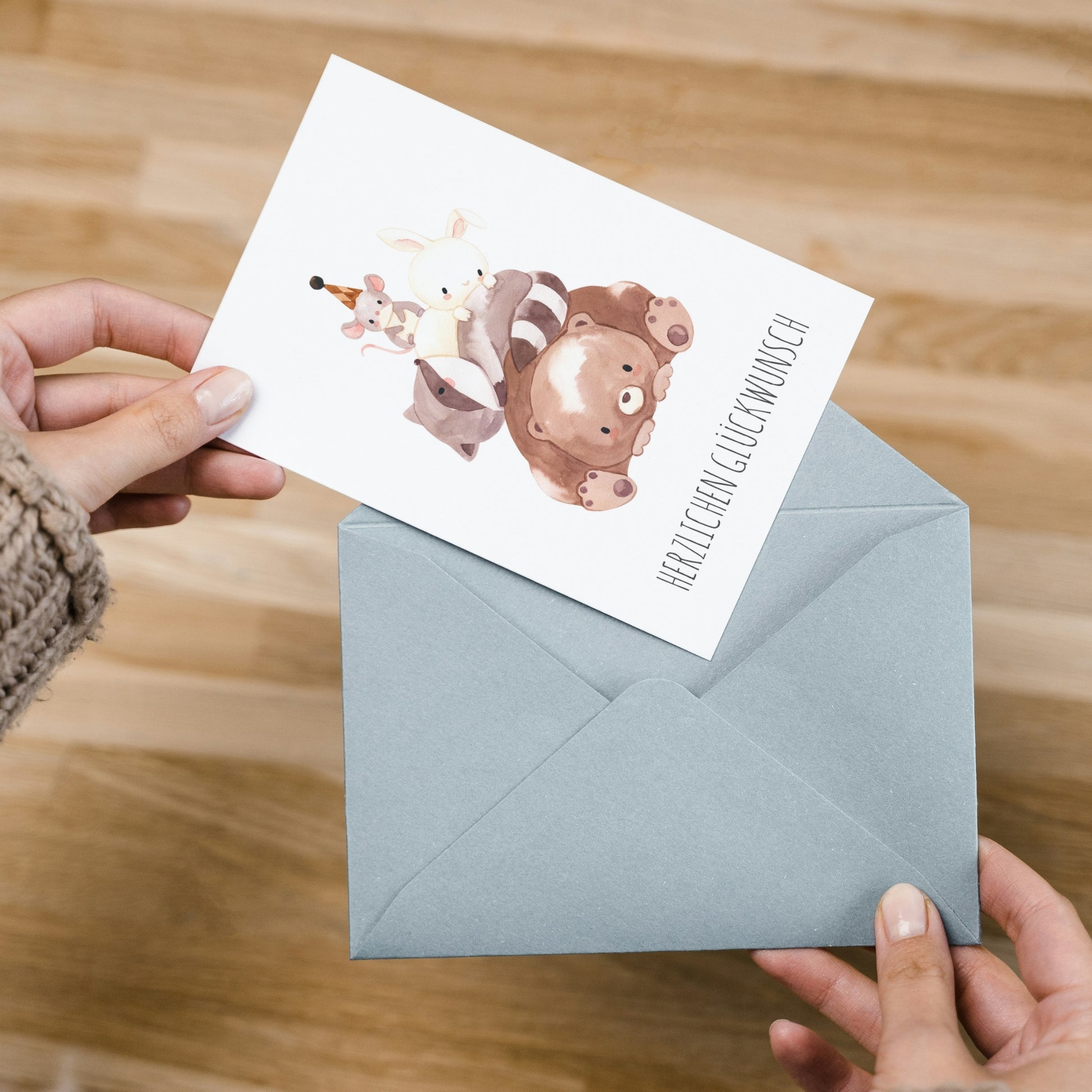 Liebevoll gestaltete Geburtstagskarte für Kinder mit niedlichen Tieren und 'Herzlichen Glückwunsch' Schriftzug, die garantiert ein Lächeln auf jedes Gesicht zaubert. Diese handgefertigte Karte ist als Glückwunschkarte zum Kindergeburtstag perfekt für kleine Geburtstagsstars, die Tiere lieben!