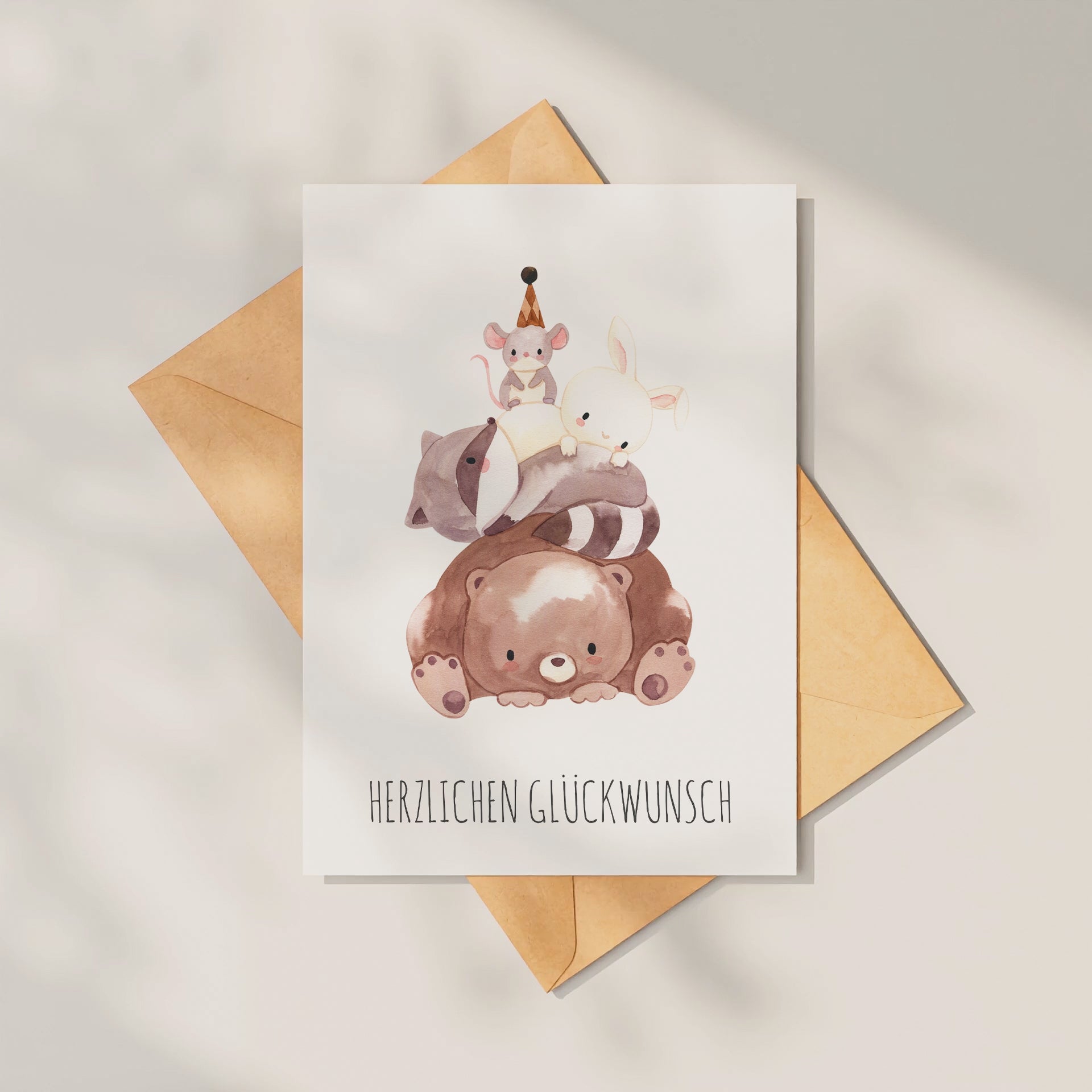 Karte Kindergeburtstag Tierpyramide - Herzlichen Glückwunsch A6