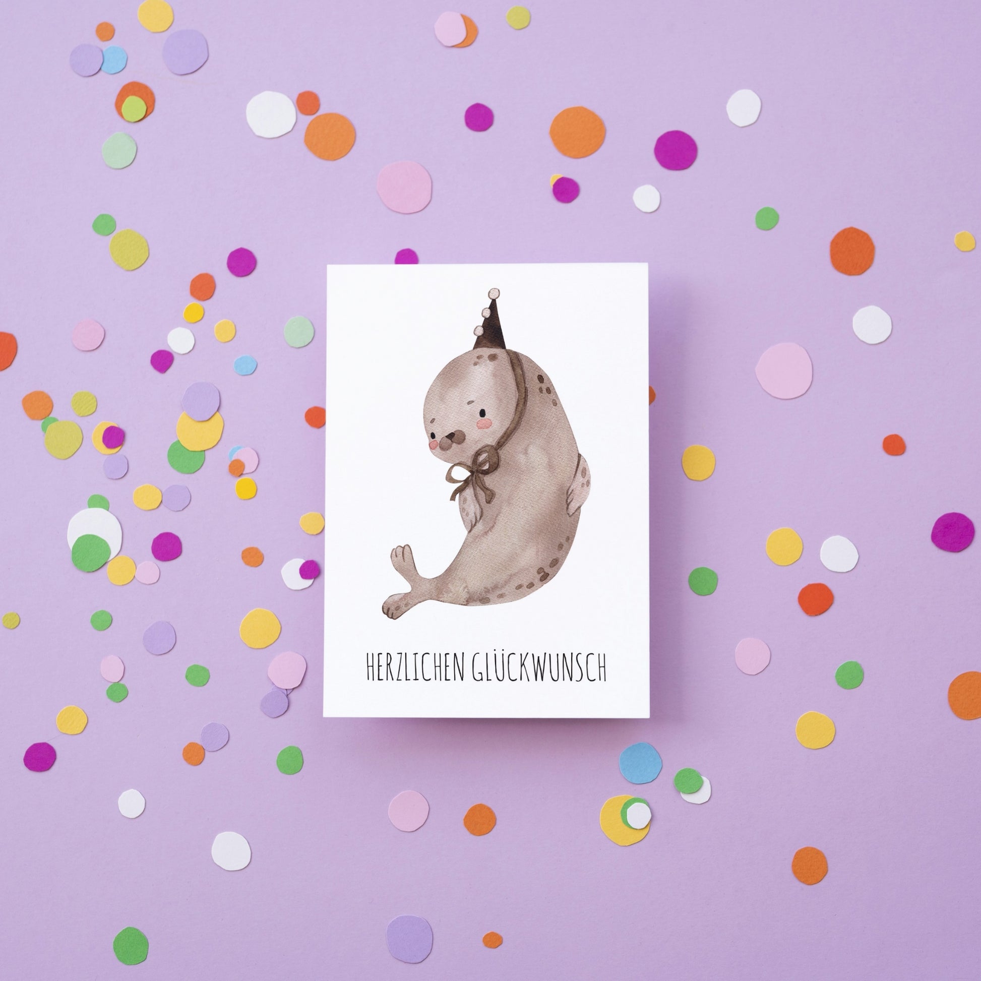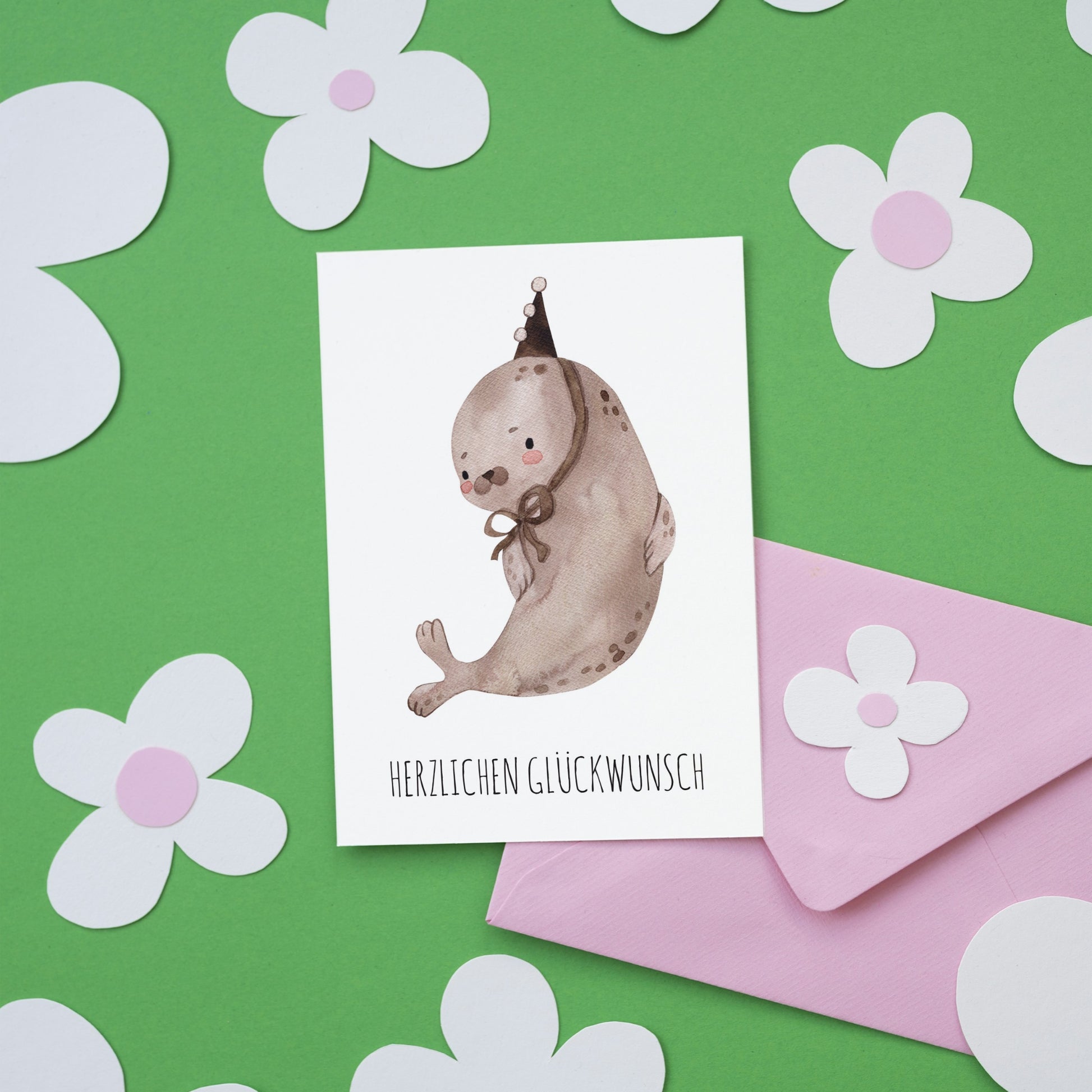 Liebevoll gestaltete Geburtstagskarte für Kinder mit niedlicher Robbe und 'Herzlichen Glückwunsch' Schriftzug, die garantiert ein Lächeln auf jedes Gesicht zaubert. Diese handgefertigte Karte ist als Glückwunschkarte zum Kindergeburtstag perfekt für kleine Geburtstagsstars, die Tiere lieben!