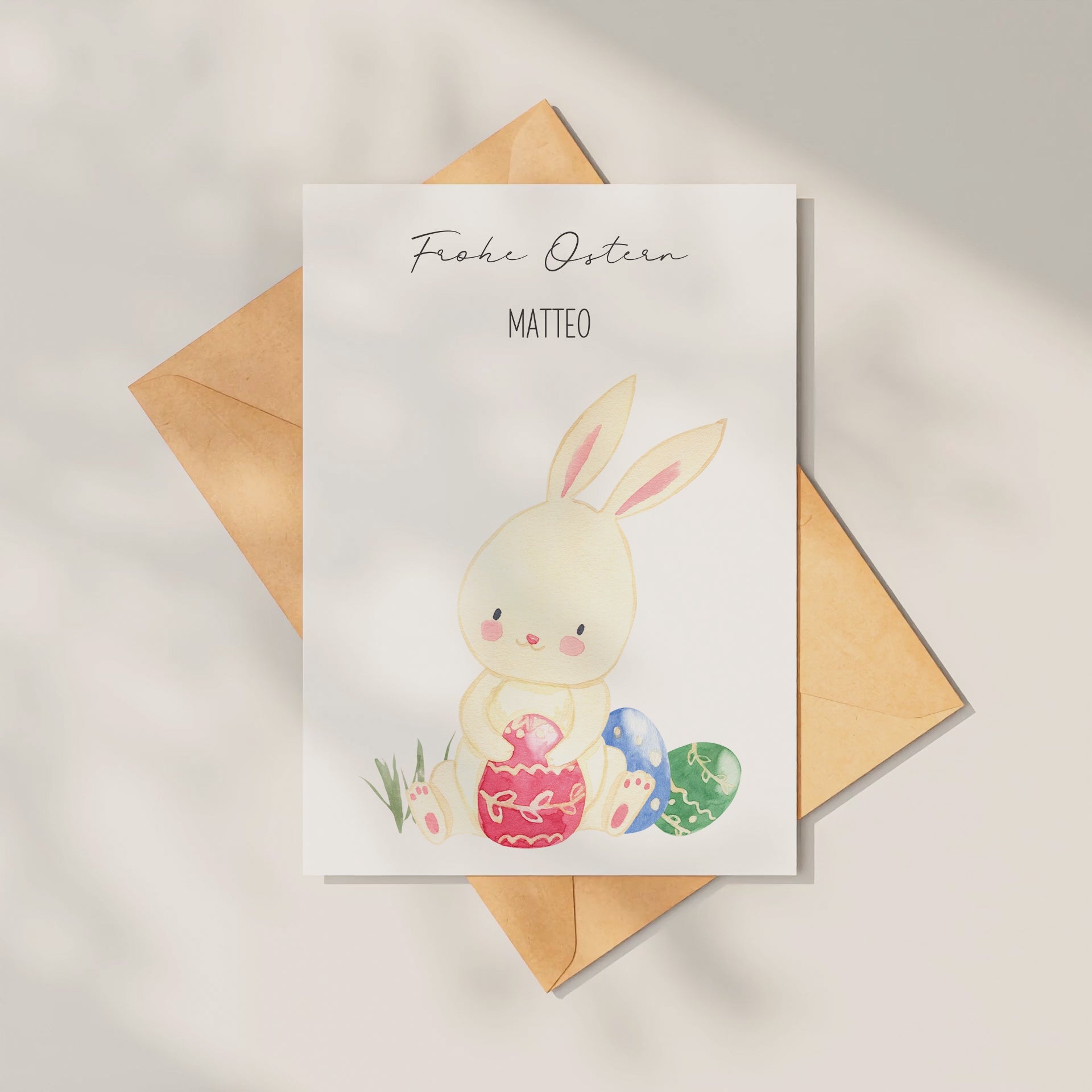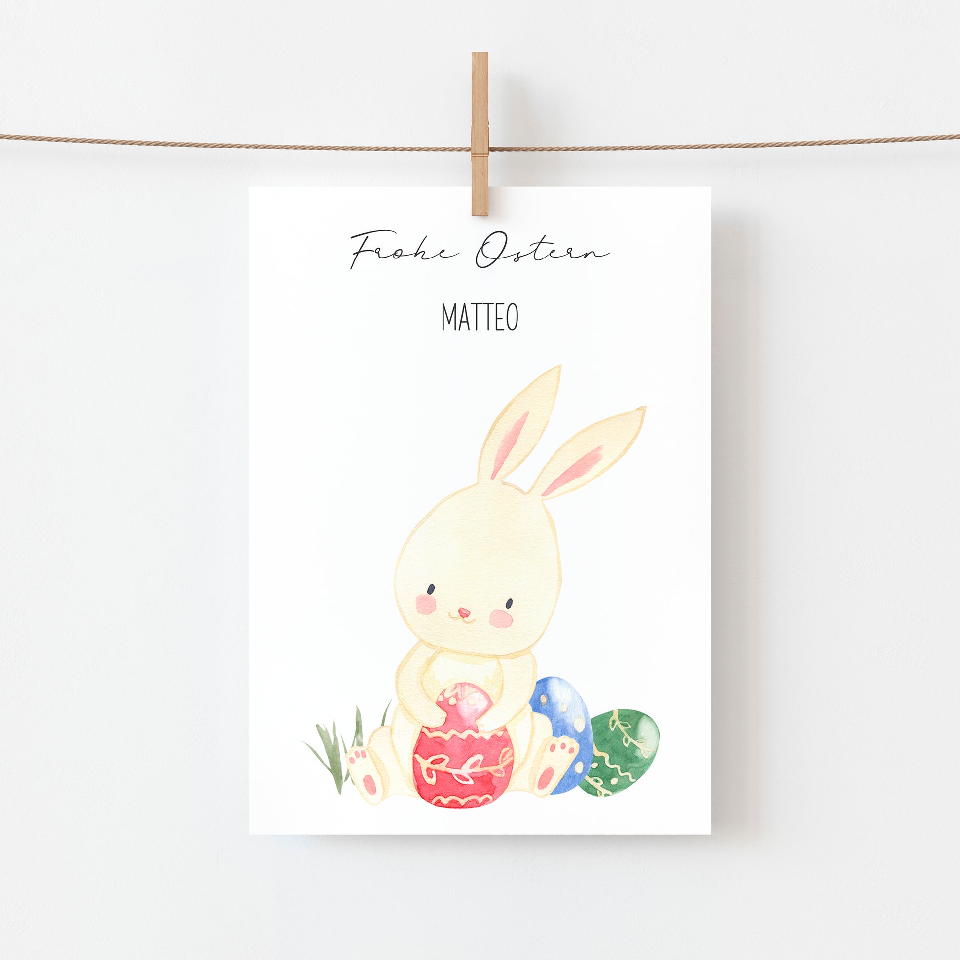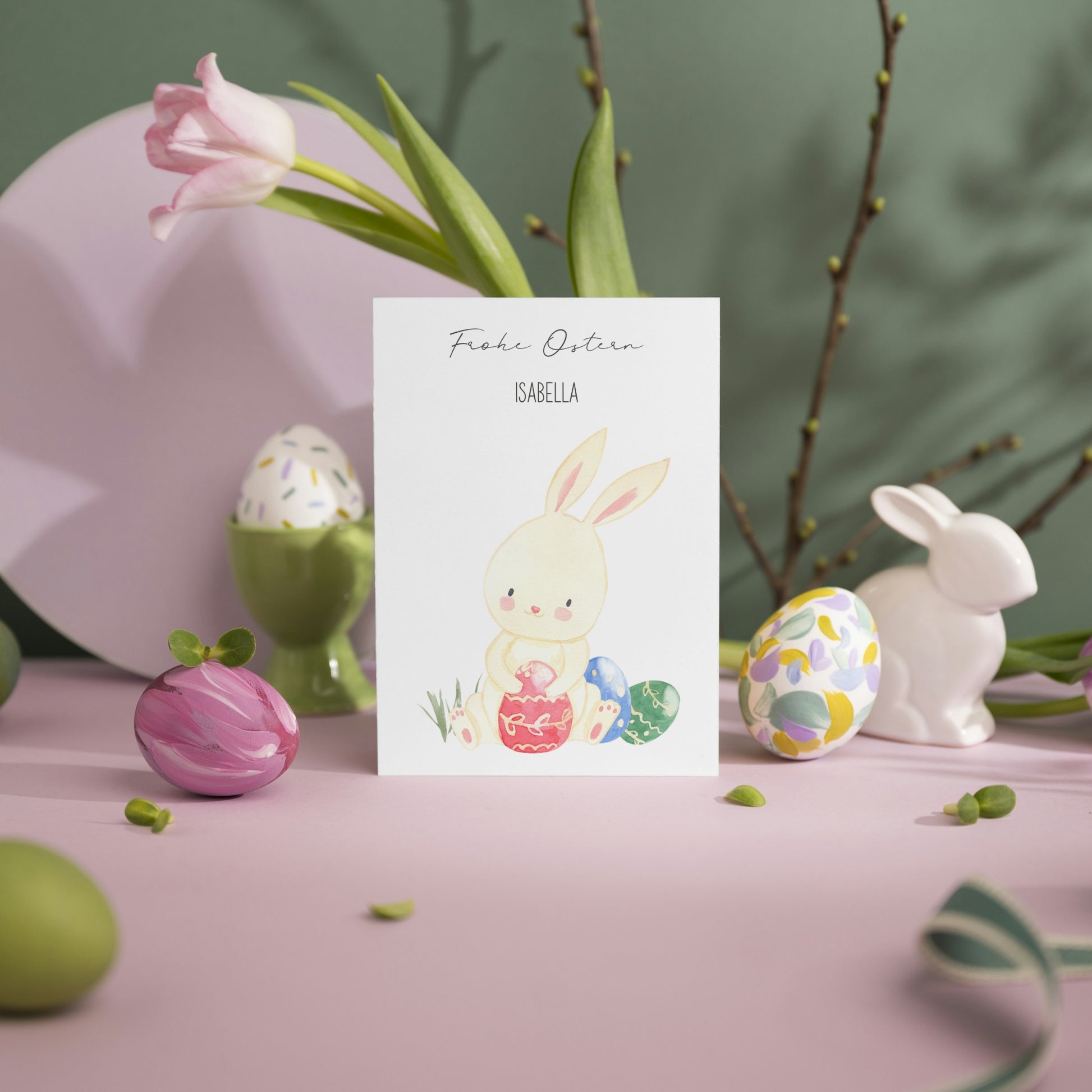 Liebevoll gestaltete Postkarte mit niedlichem Hasen und Ostereinern. Die Osterkarte mit Namen personalisiert ist perfekt für Ostergrüße für Kinder und Familie oder als süße Beilage zum Geschenk.