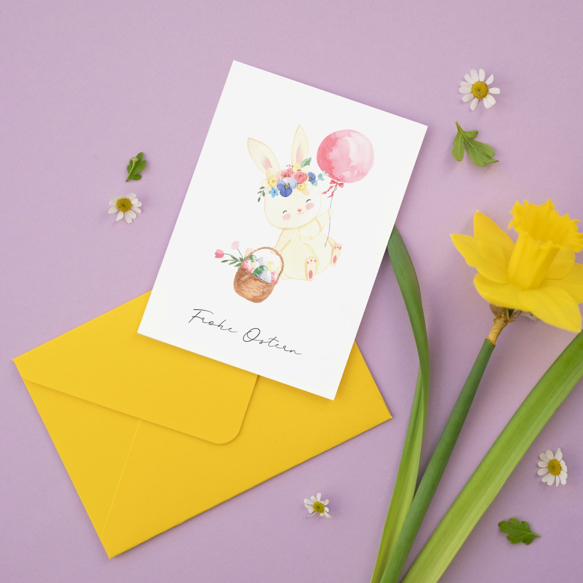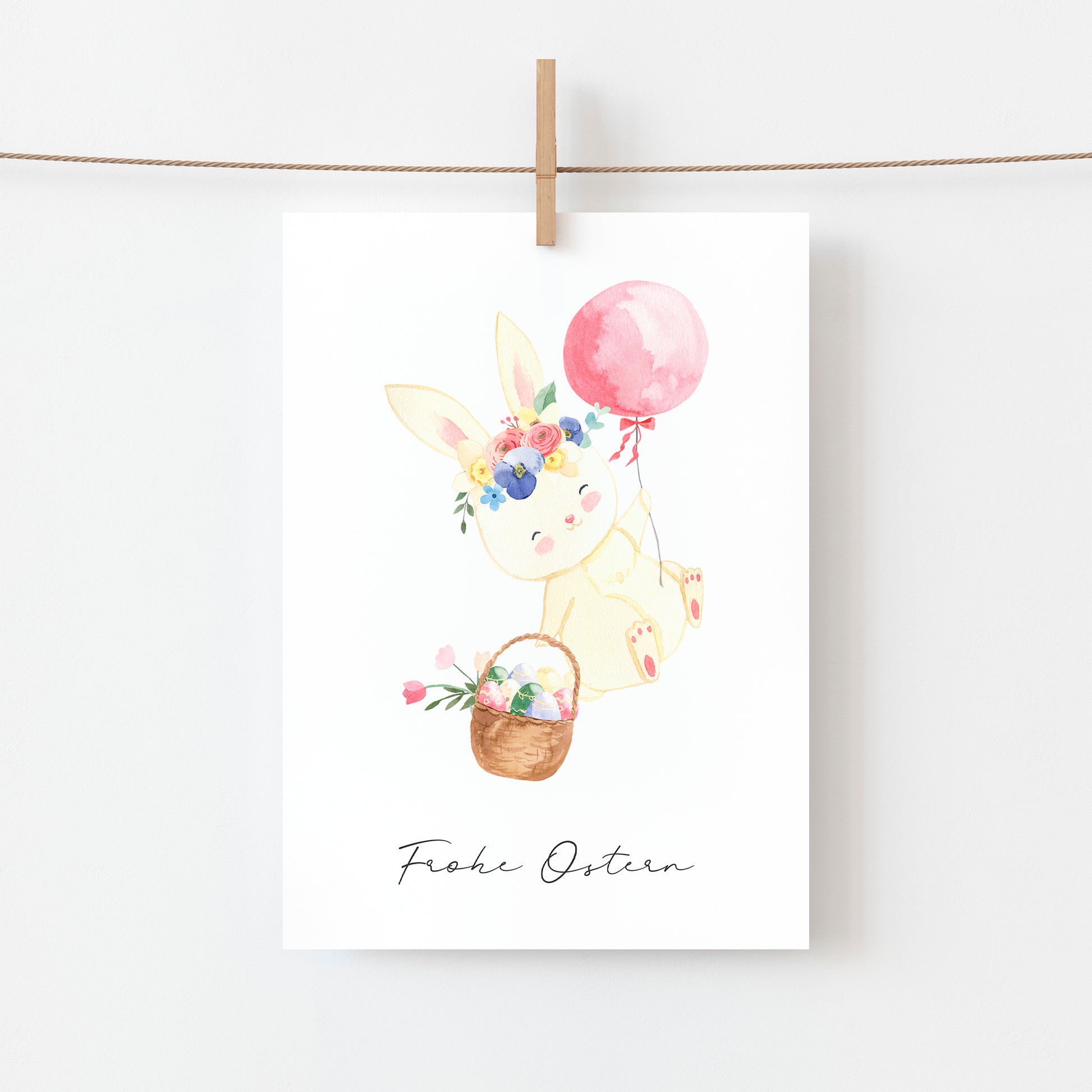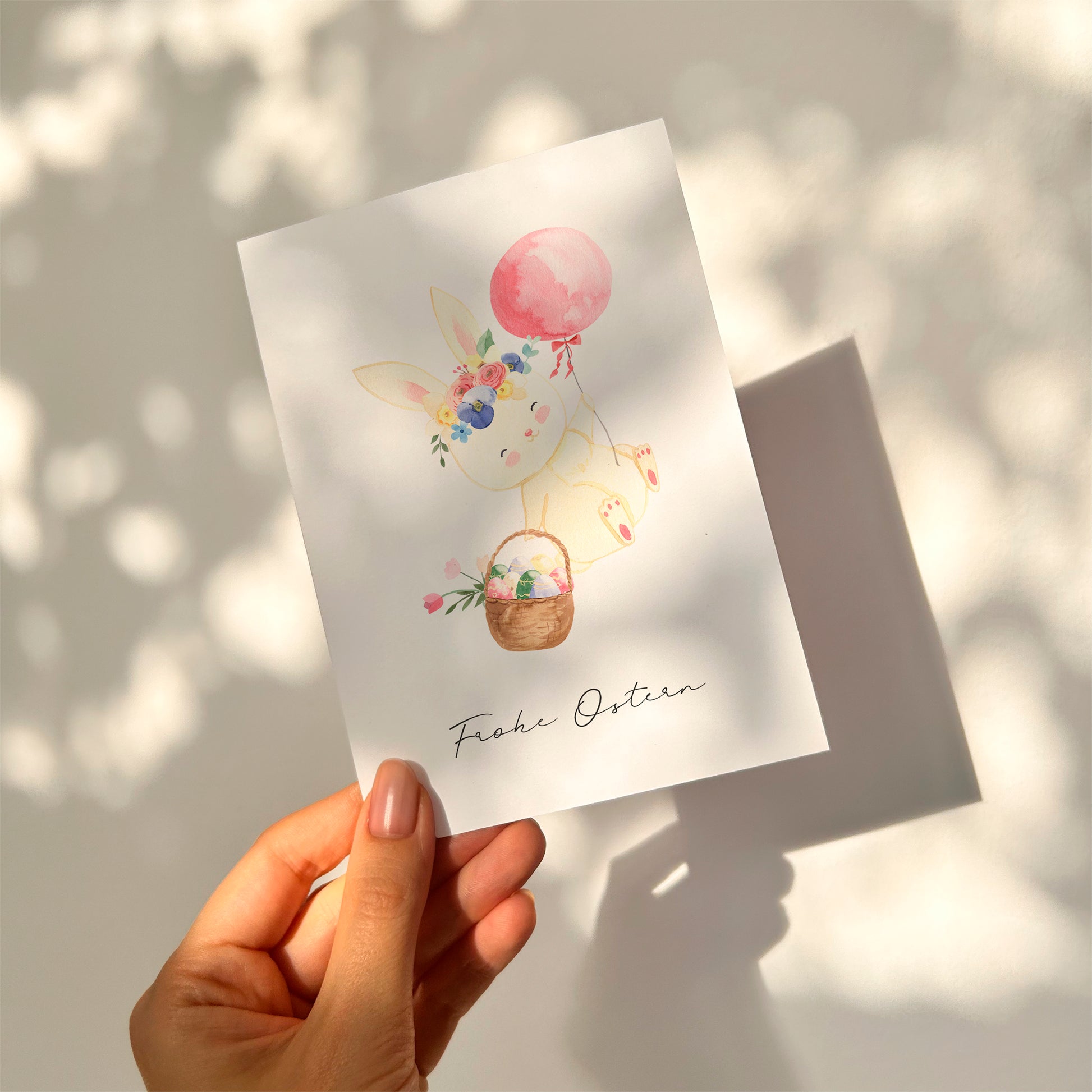 Liebevoll gestaltete Postkarte mit niedlichem Hasen mit Ballon und Osterkorb und 'Frohe Ostern' Schriftzug. Perfekt als süße Osterkarte oder als Karte zum Ostergeschenk.
