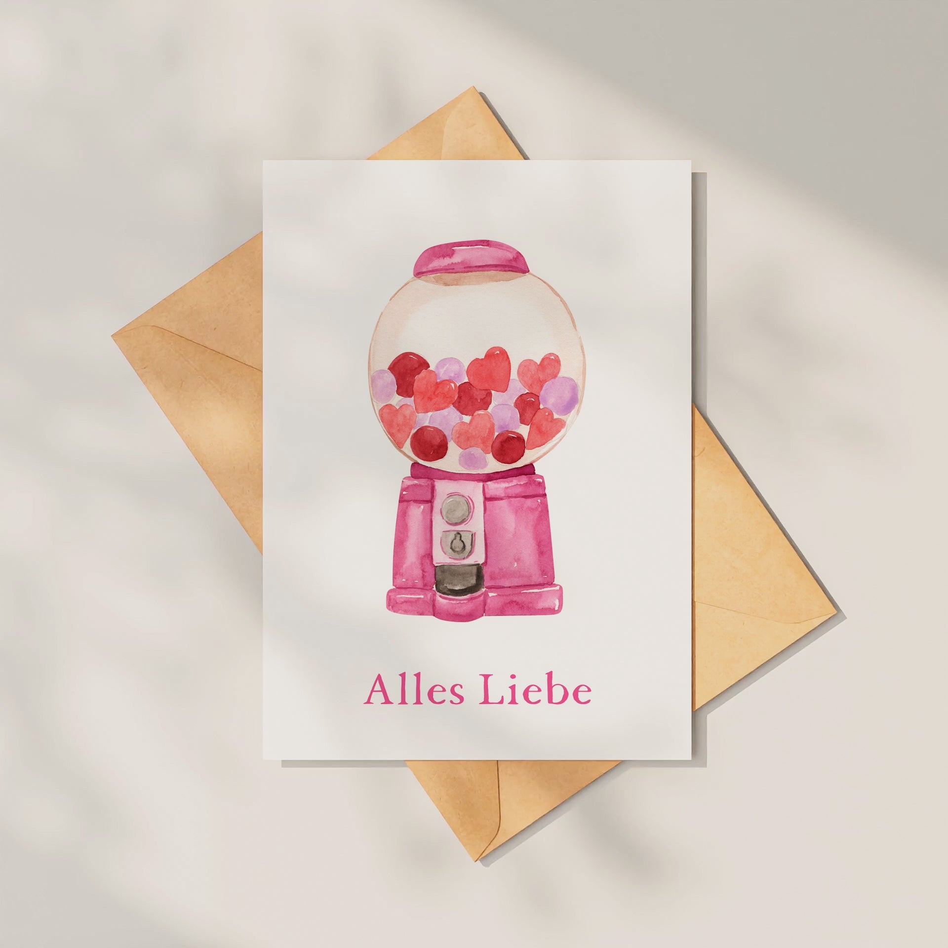 Liebevoll gestaltete Postkarte mit zauberhaftem Retro-Motiv mit Süßigkeiten in Herzform und "Alles Liebe" Schriftzug. Perfekt für liebe Grüße für die beste Freundin oder Liebelingsmenschen und als Glückwünsche zur Hochzeit oder Verlobung.