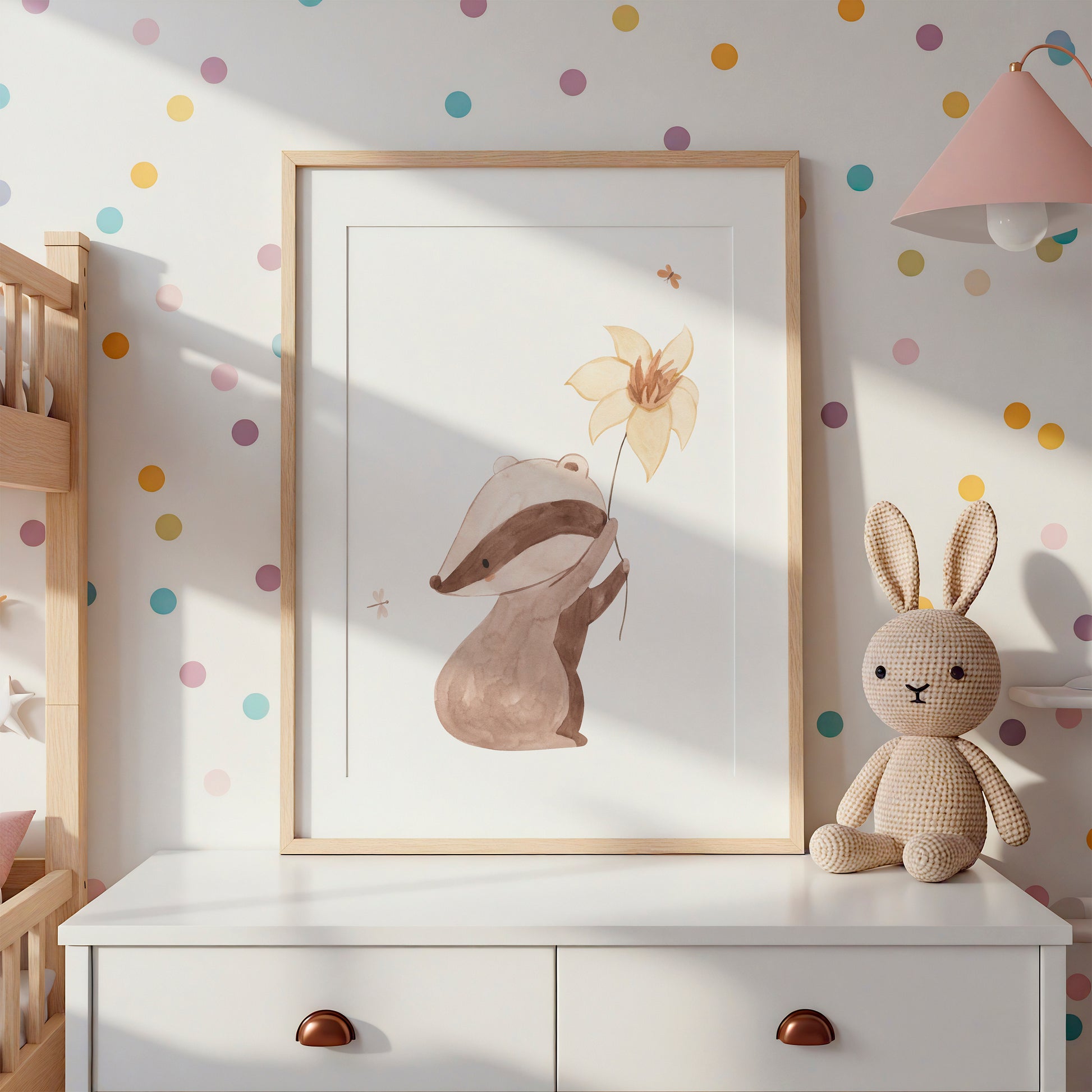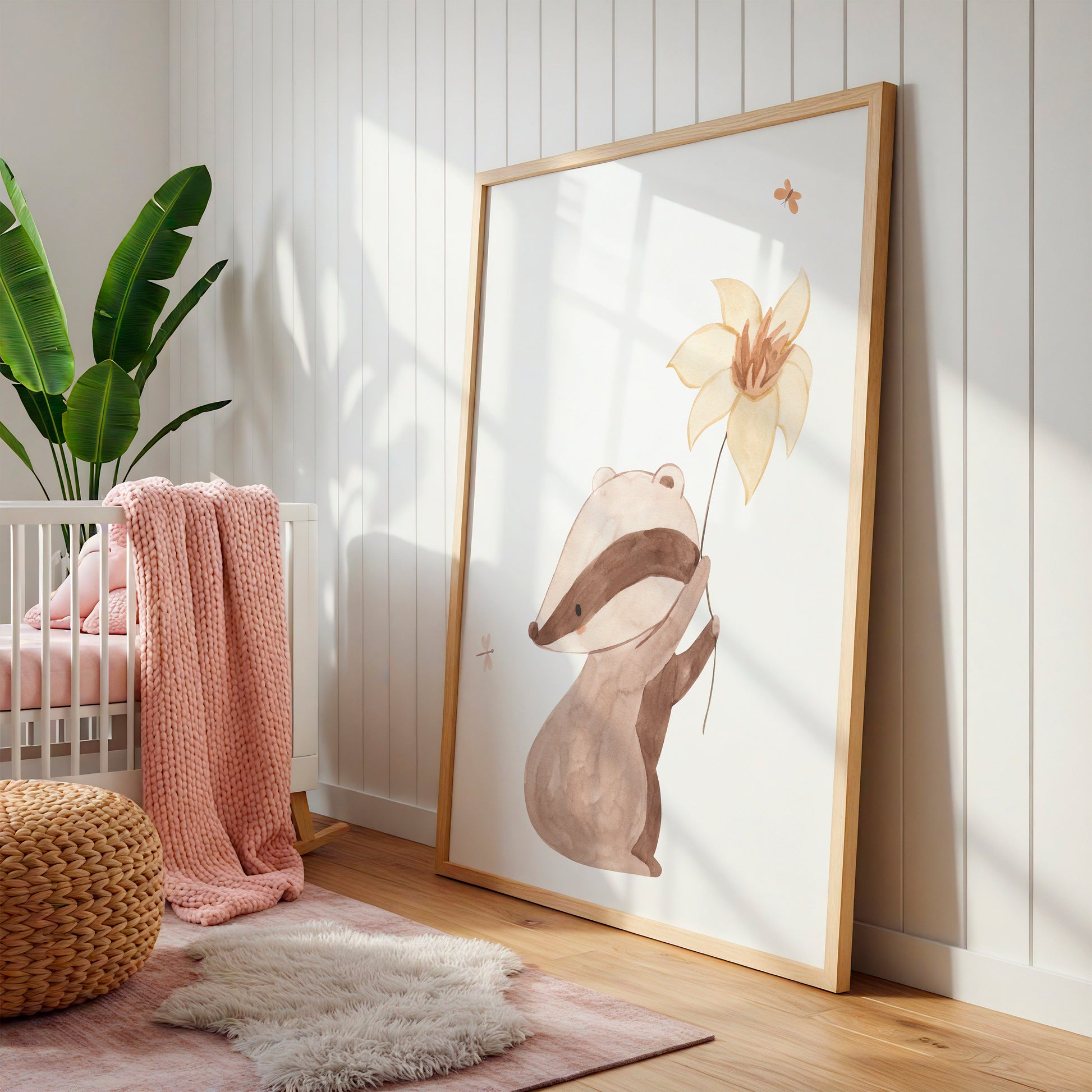 Dieses zauberhaft gestaltete Kinderbild mit dem süßen Dachs und seiner Blume im Boho Stil ist die perfekte Dekoration für das Kinderzimmer. Mit seinem verspielten Design und der detaillierten Illustration lässt das Poster Kinderaugen strahlen.