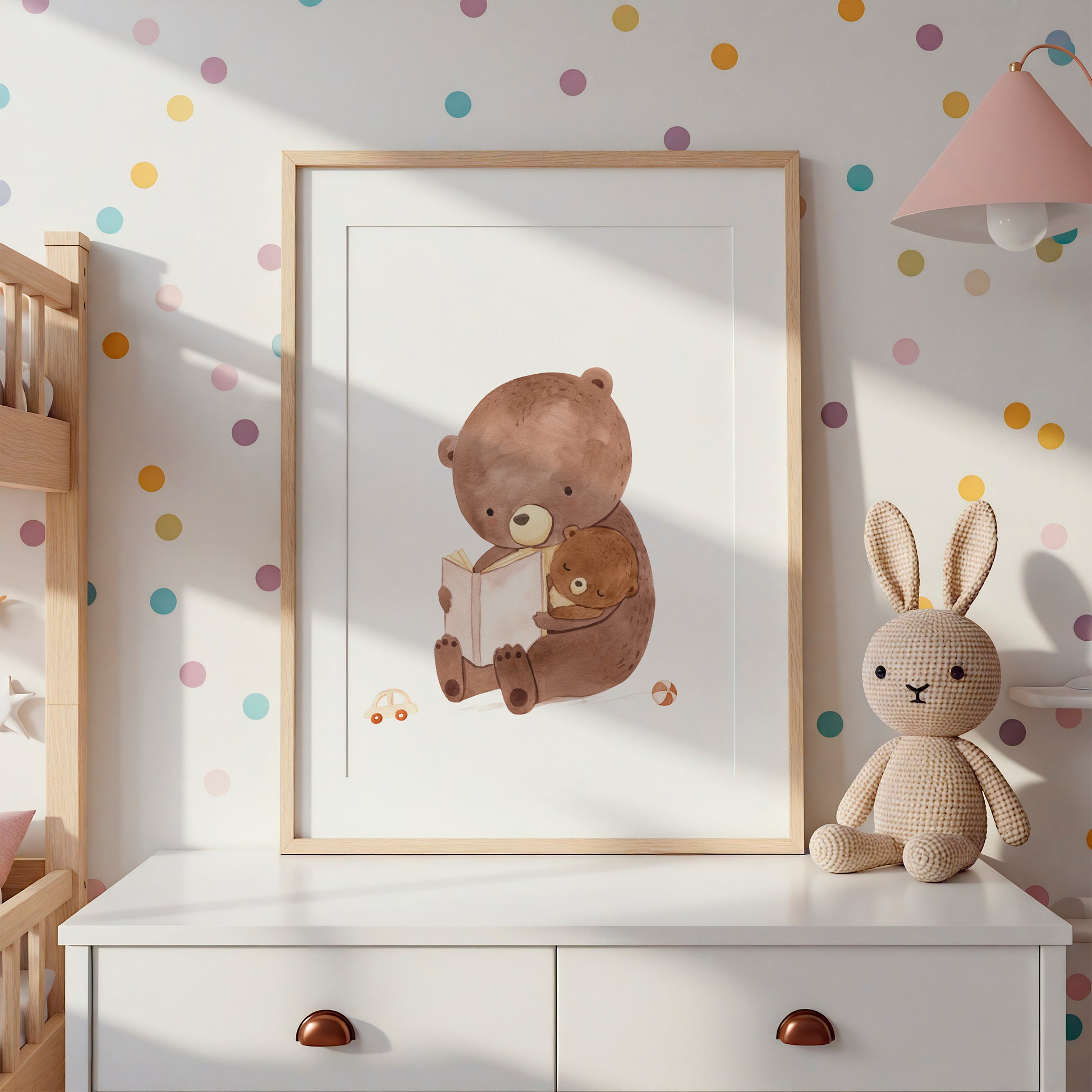 Dieses wunderschöne Poster mit Mama/Papa Bär beim Vorlesen bringt Liebe ins Kinderzimmer. Es eignet sich als Kinderzimmerdeko, als Geschenk zum Geburtstag oder für Babys zur Geburt. Das Poster ist ideal für kleine Träumer und schafft eine geborgene und friedliche Atmosphäre.