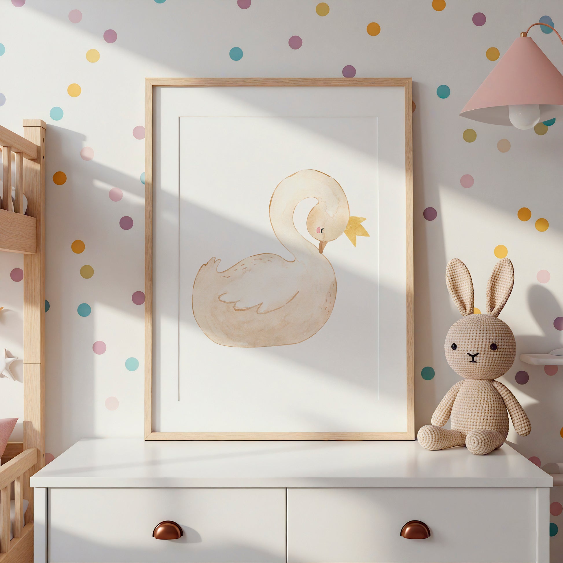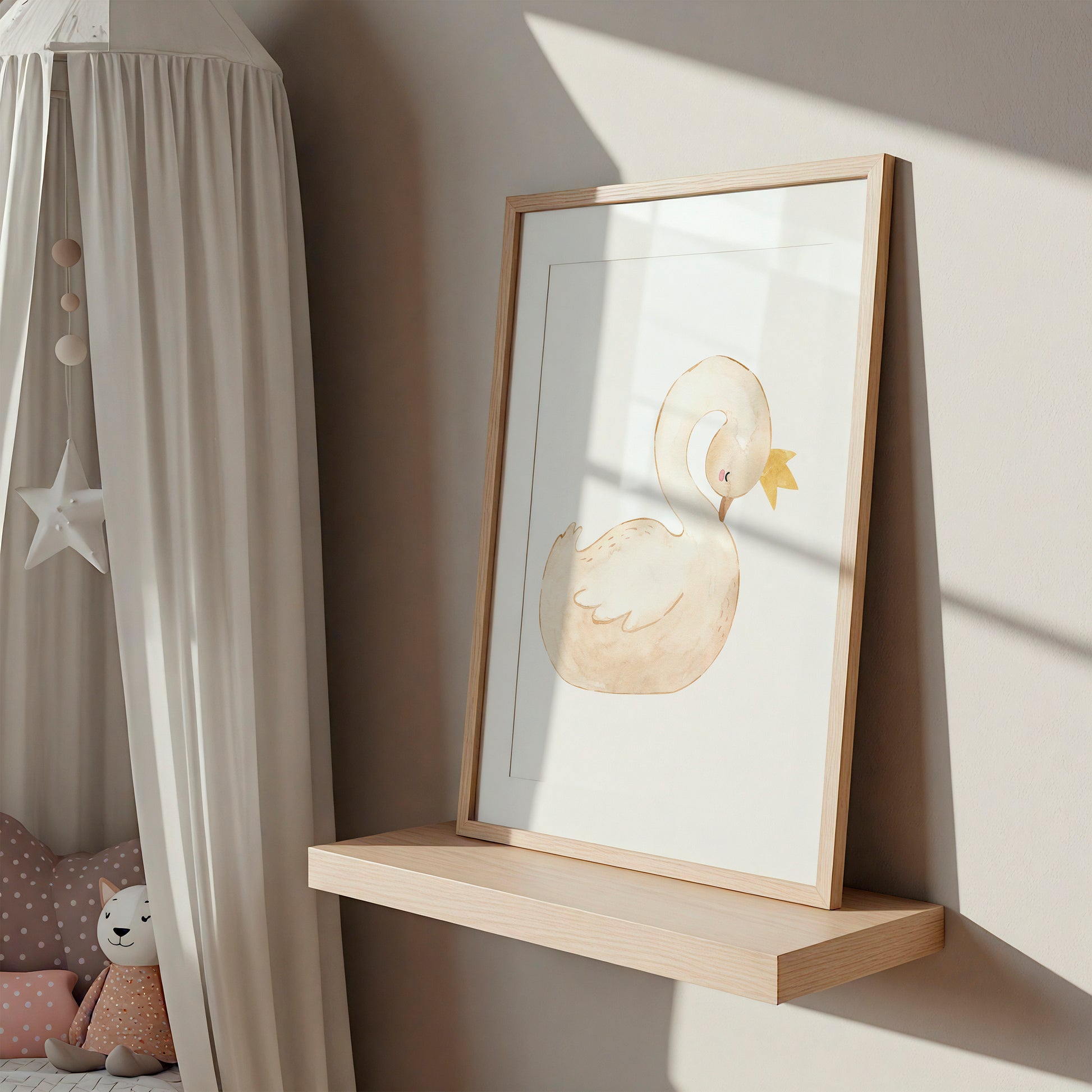 Dieses Kinderbild mit dem zauberhaften Schwan ist die perfekte Dekoration für das Mädchenzimmer. Mit seinem wunderschönen Design und der detaillierten Illustration lässt das Poster Kinderaugen strahlen.