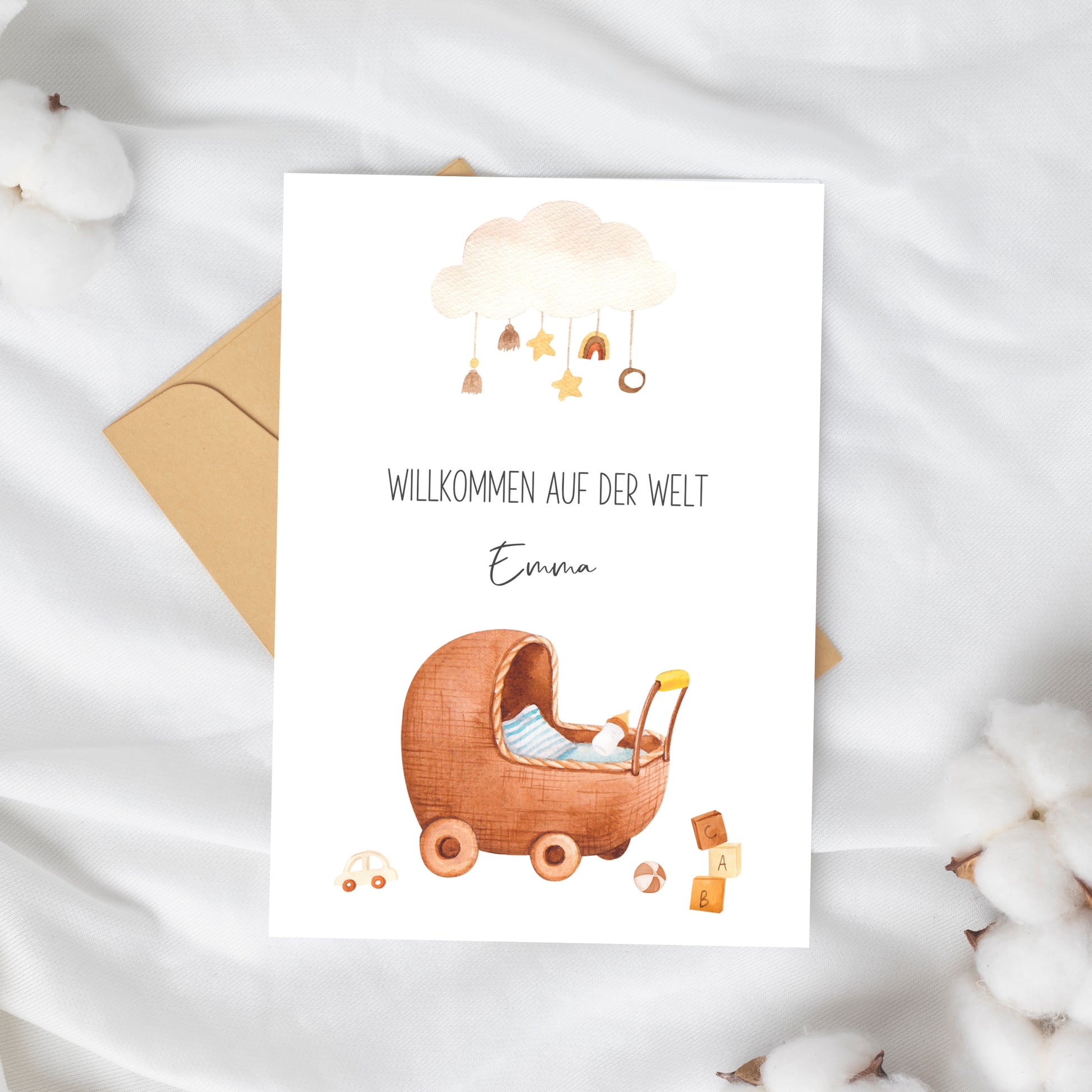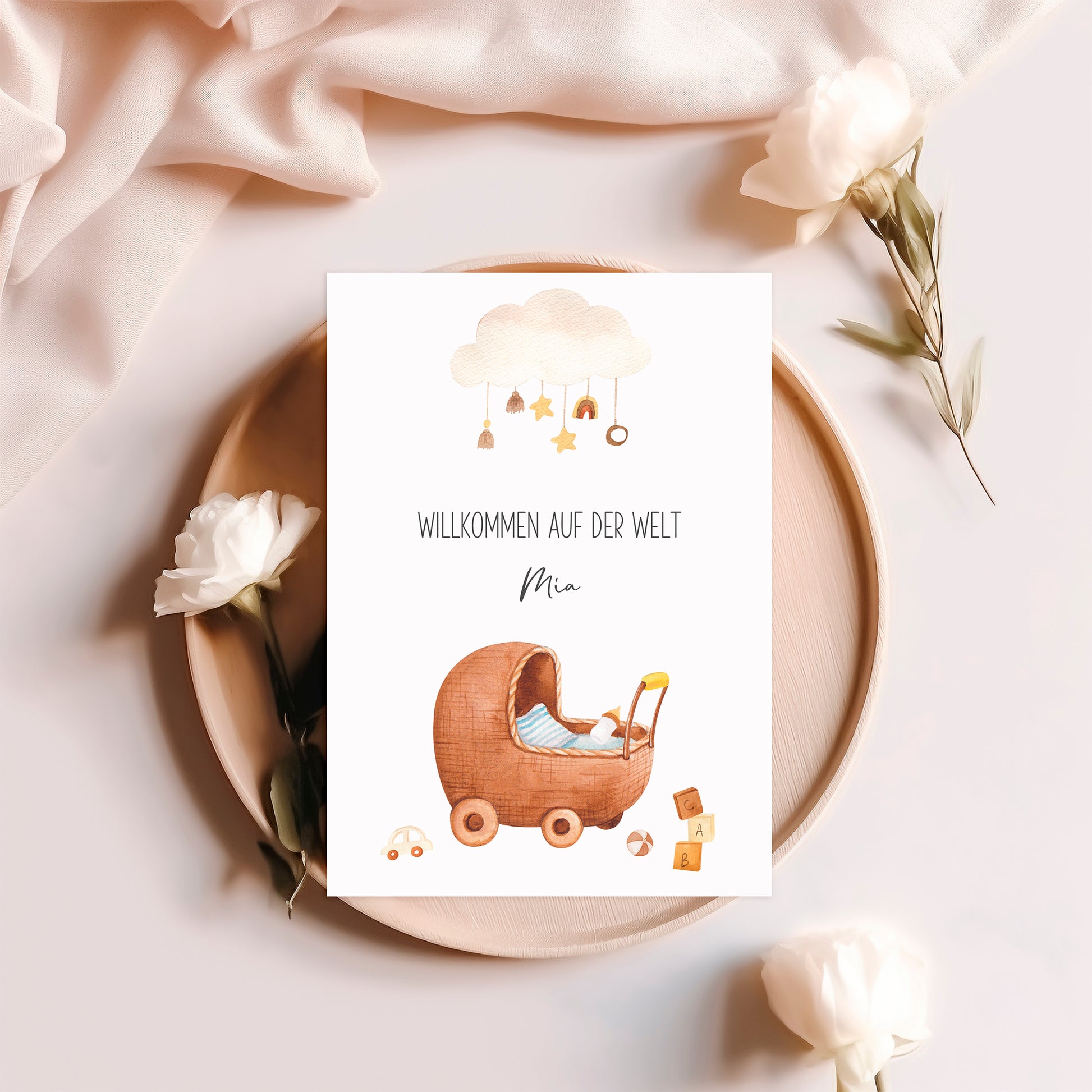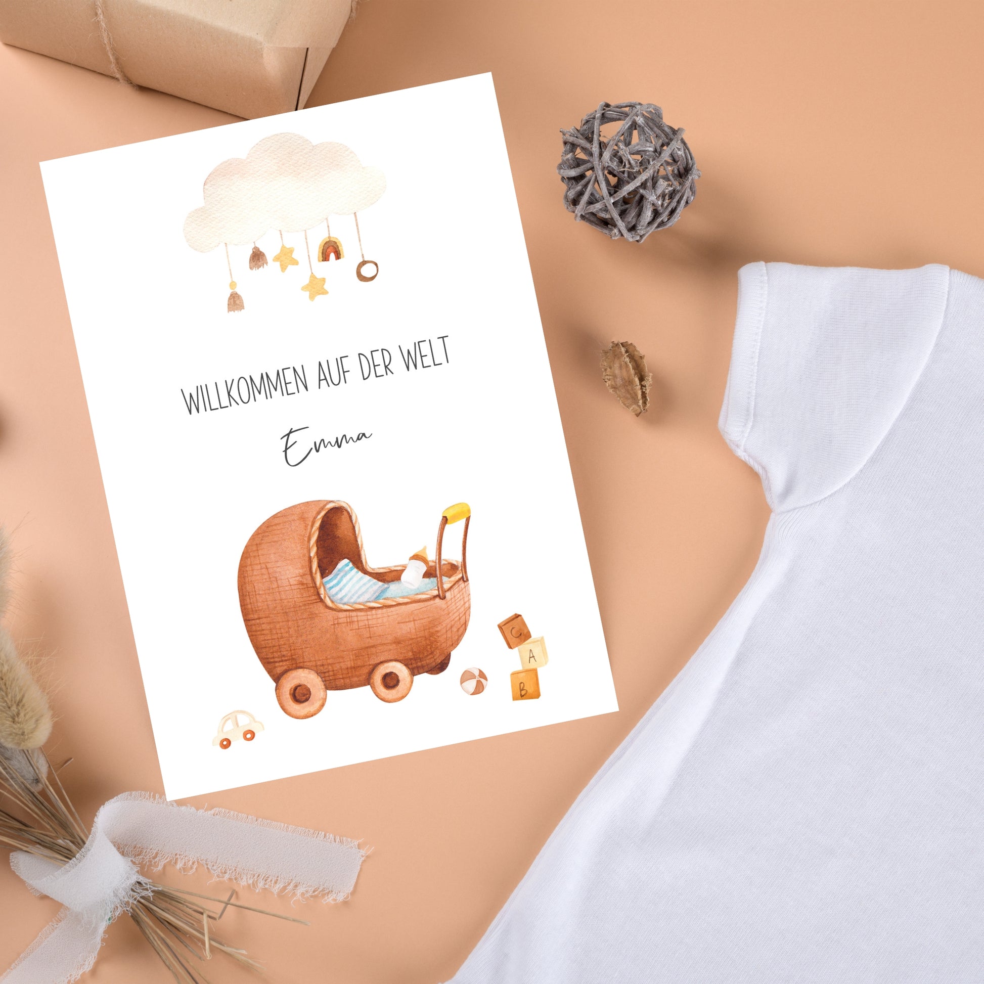 Liebevoll gestaltete Geburtskarte personalisiert mit Namen, mit süßem Kinderwagen Motiv im Boho-Stil und ‚Willkommen auf der Welt‘ Schriftzug. Perfekt als Glückwunschkarte zur Geburt oder als Geschenk für das Baby.