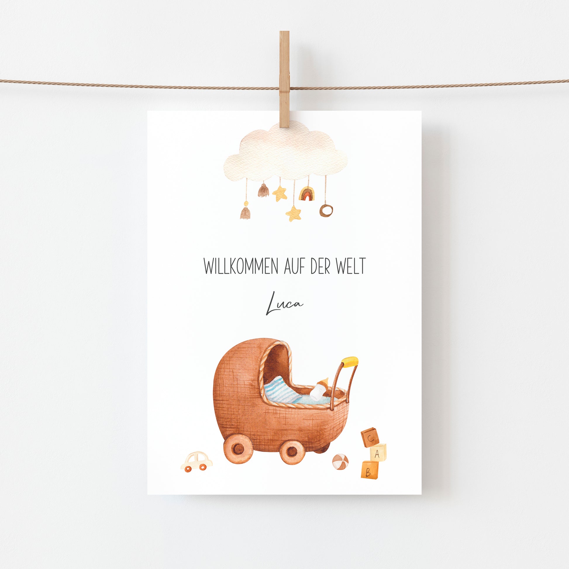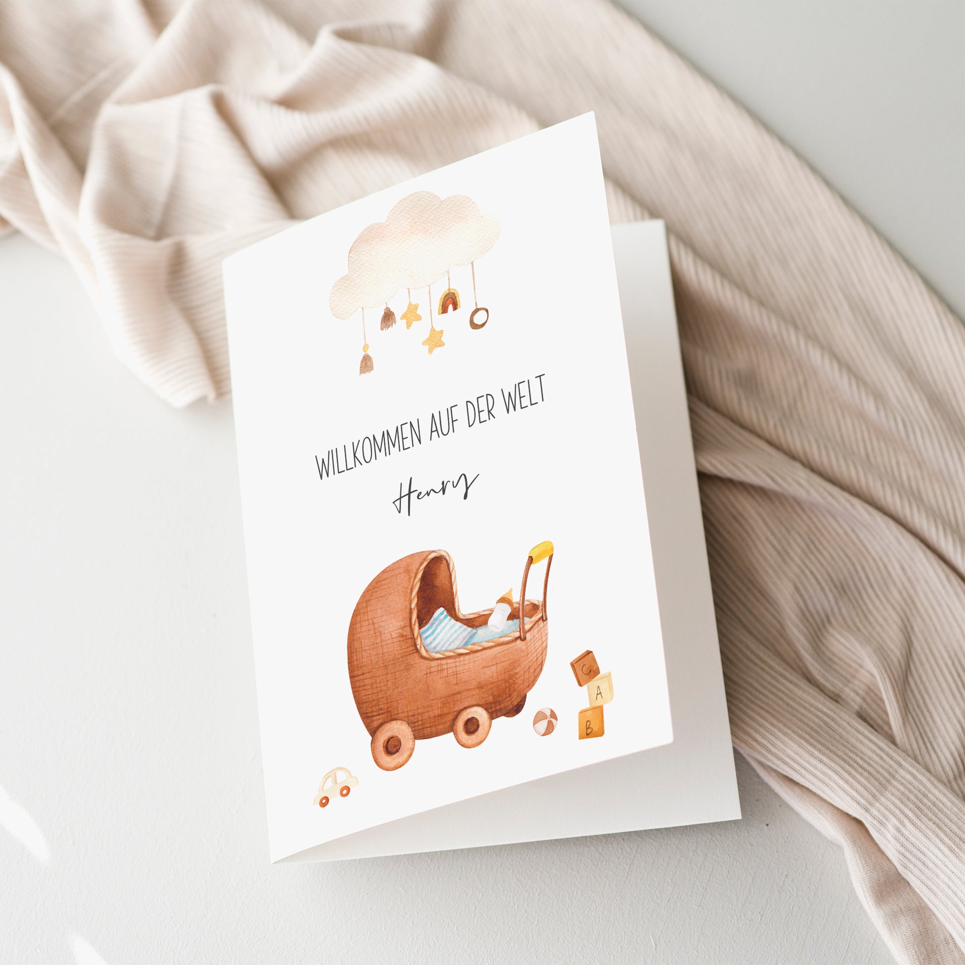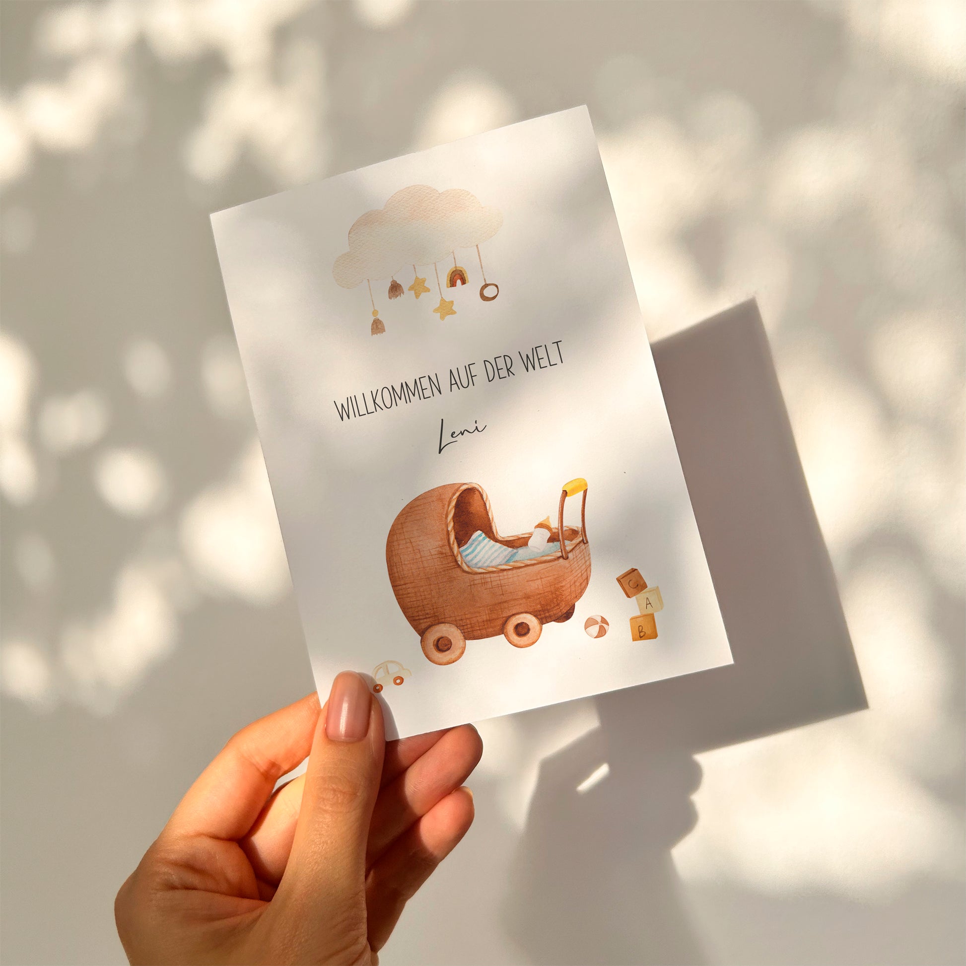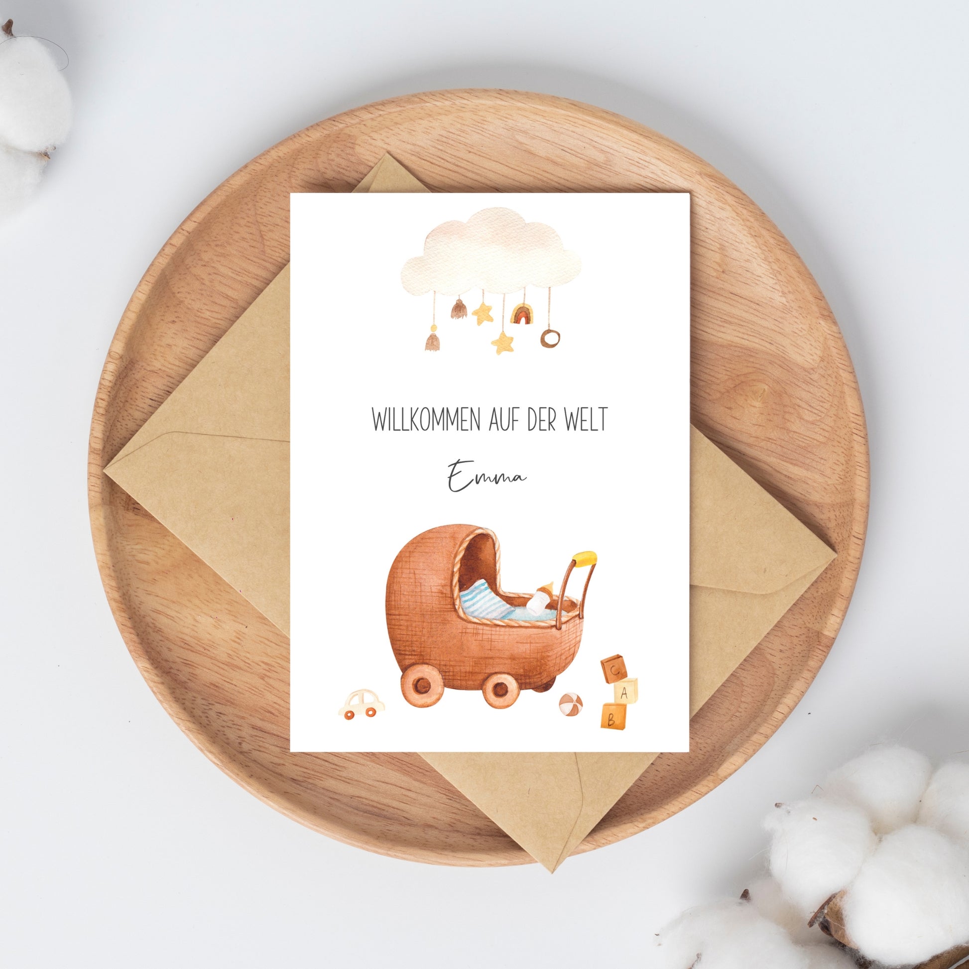 Liebevoll gestaltete Geburtskarte personalisiert mit Namen, mit süßem Kinderwagen Motiv im Boho-Stil und ‚Willkommen auf der Welt‘ Schriftzug. Perfekt als Glückwunschkarte zur Geburt oder als Geschenk für das Baby.