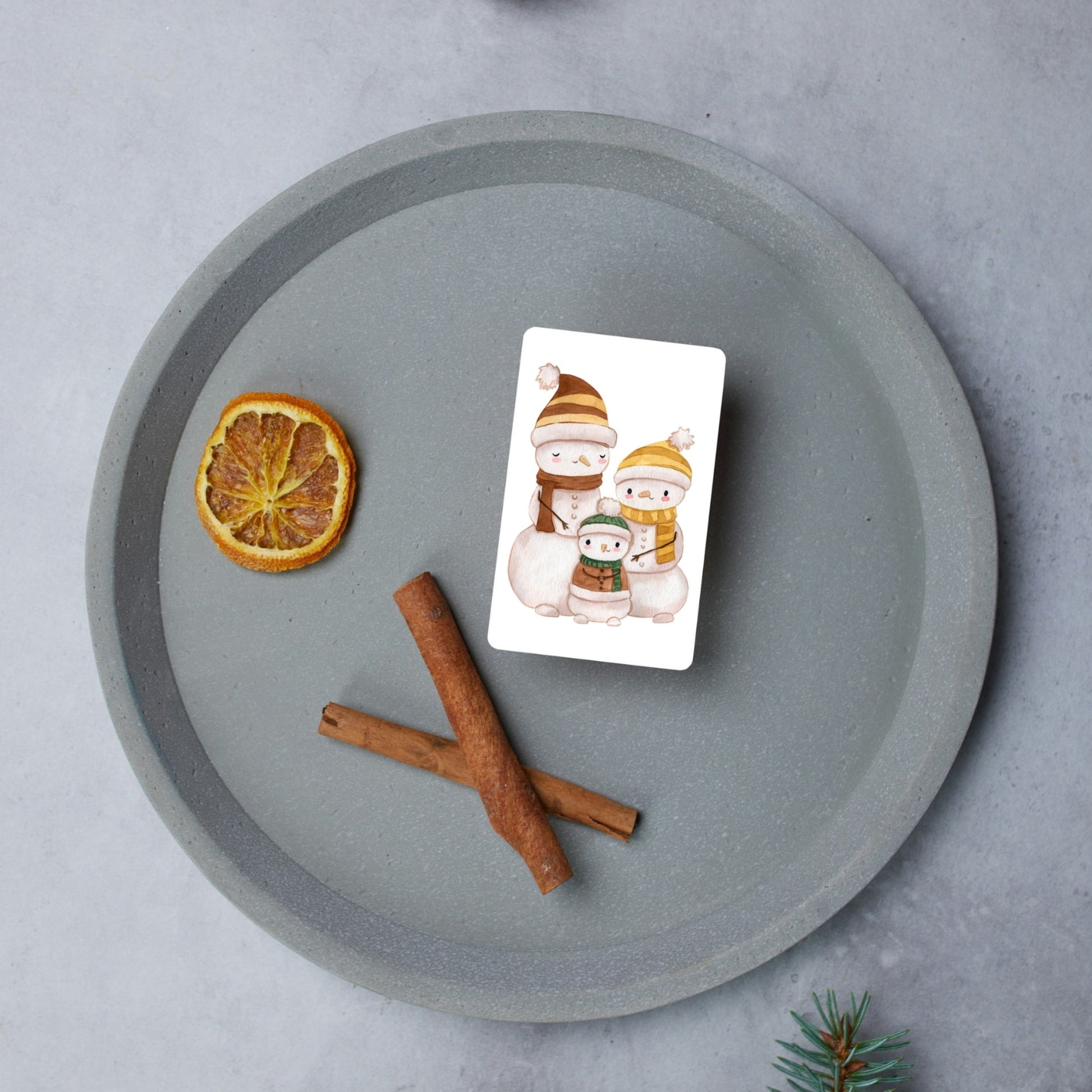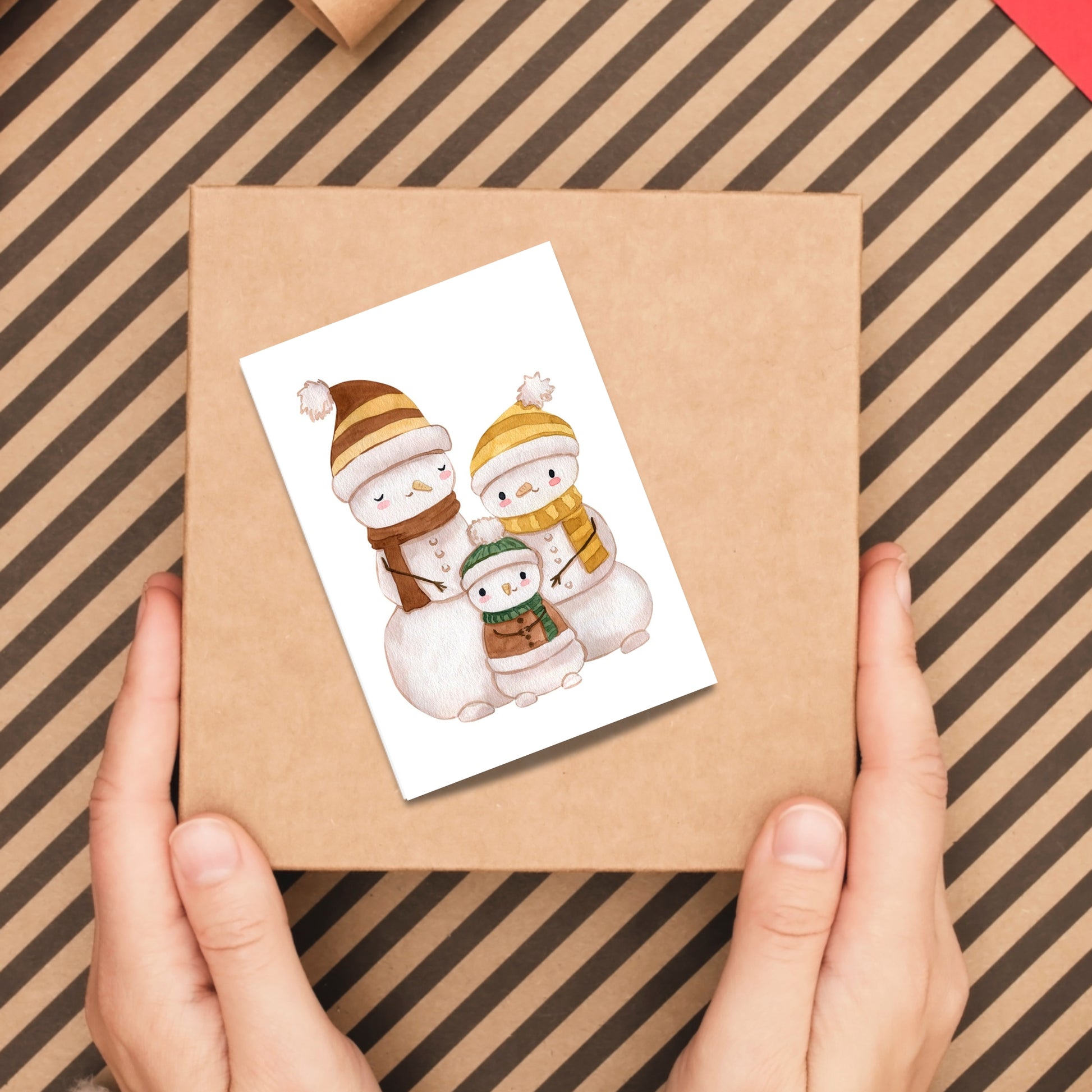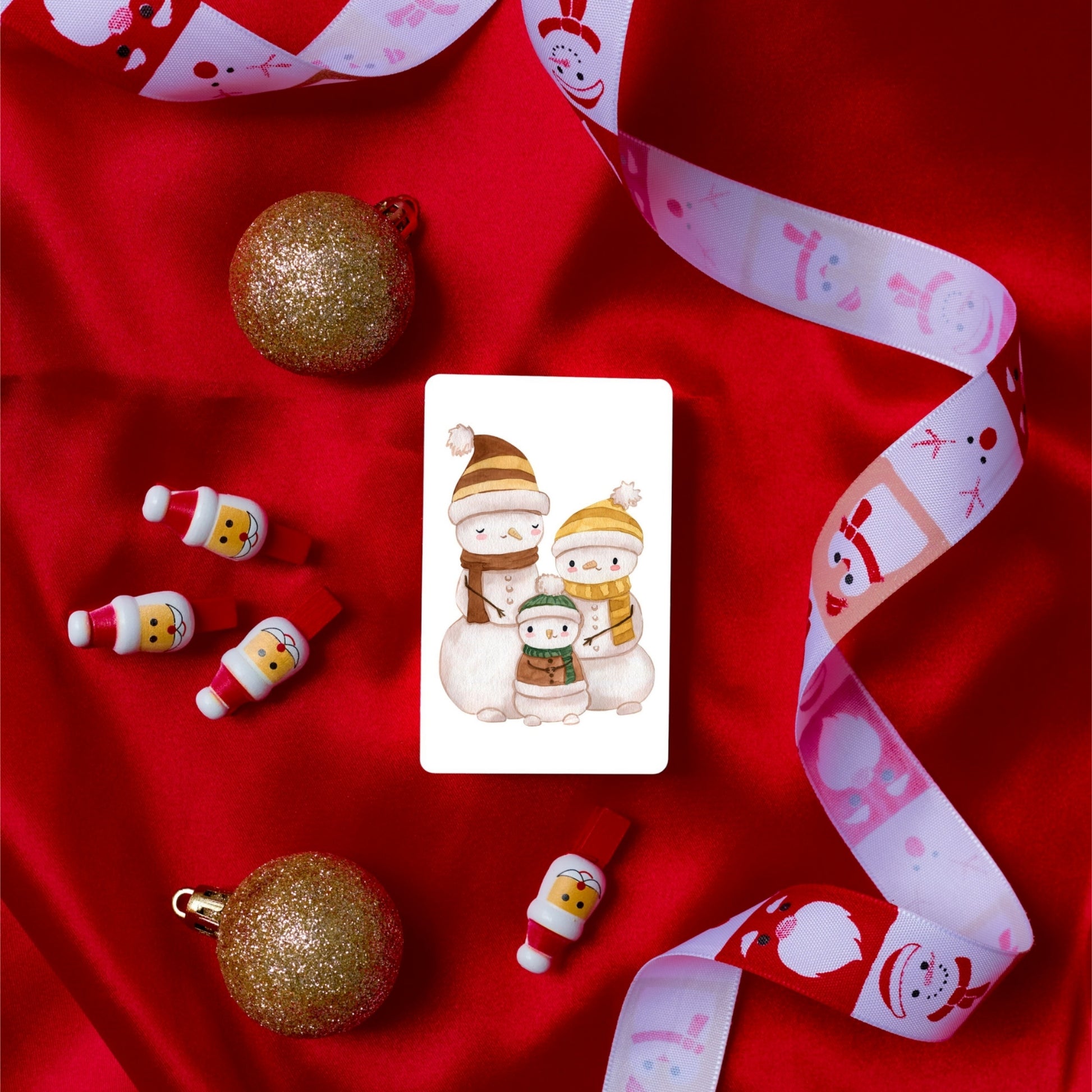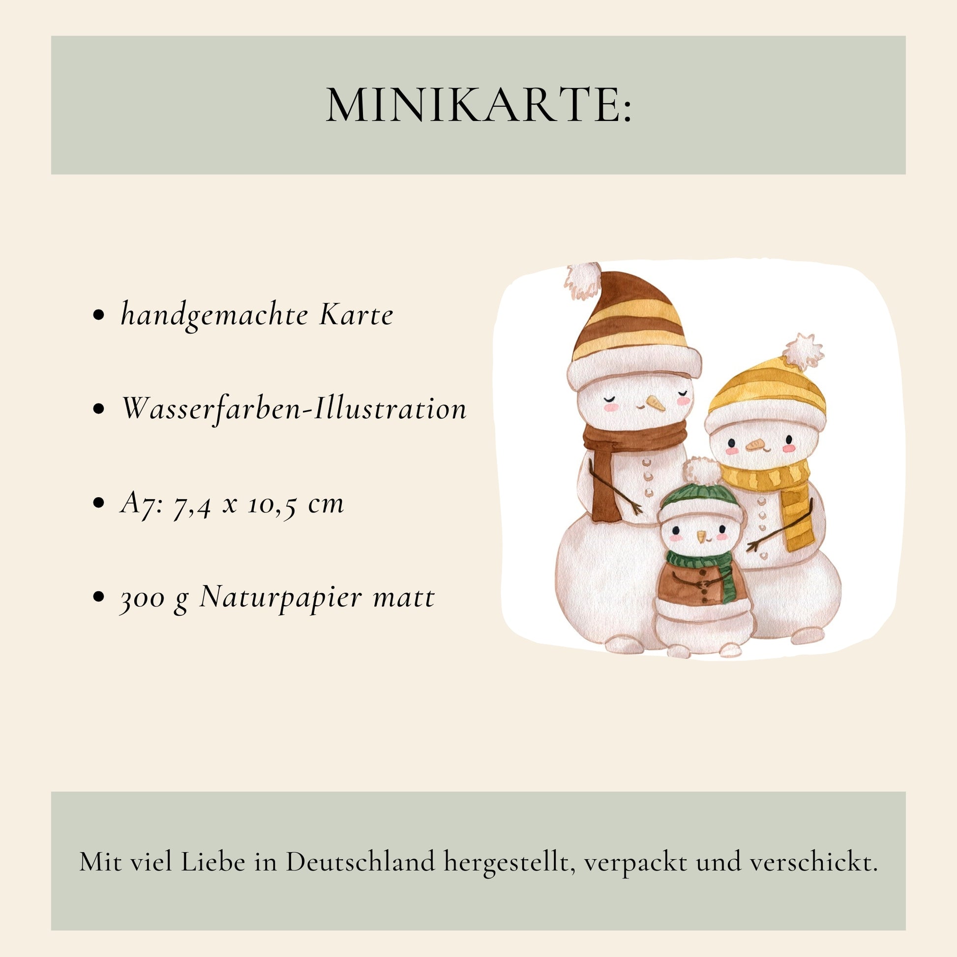 Liebevoll gestaltete Mini-Weihnachtskarte mit süßer Schneemann Familie Illustration. Perfekt für kleine Weihnachtsgrüße, für den Adventskalender oder als Karte zum Weihnachtsgeschenk.