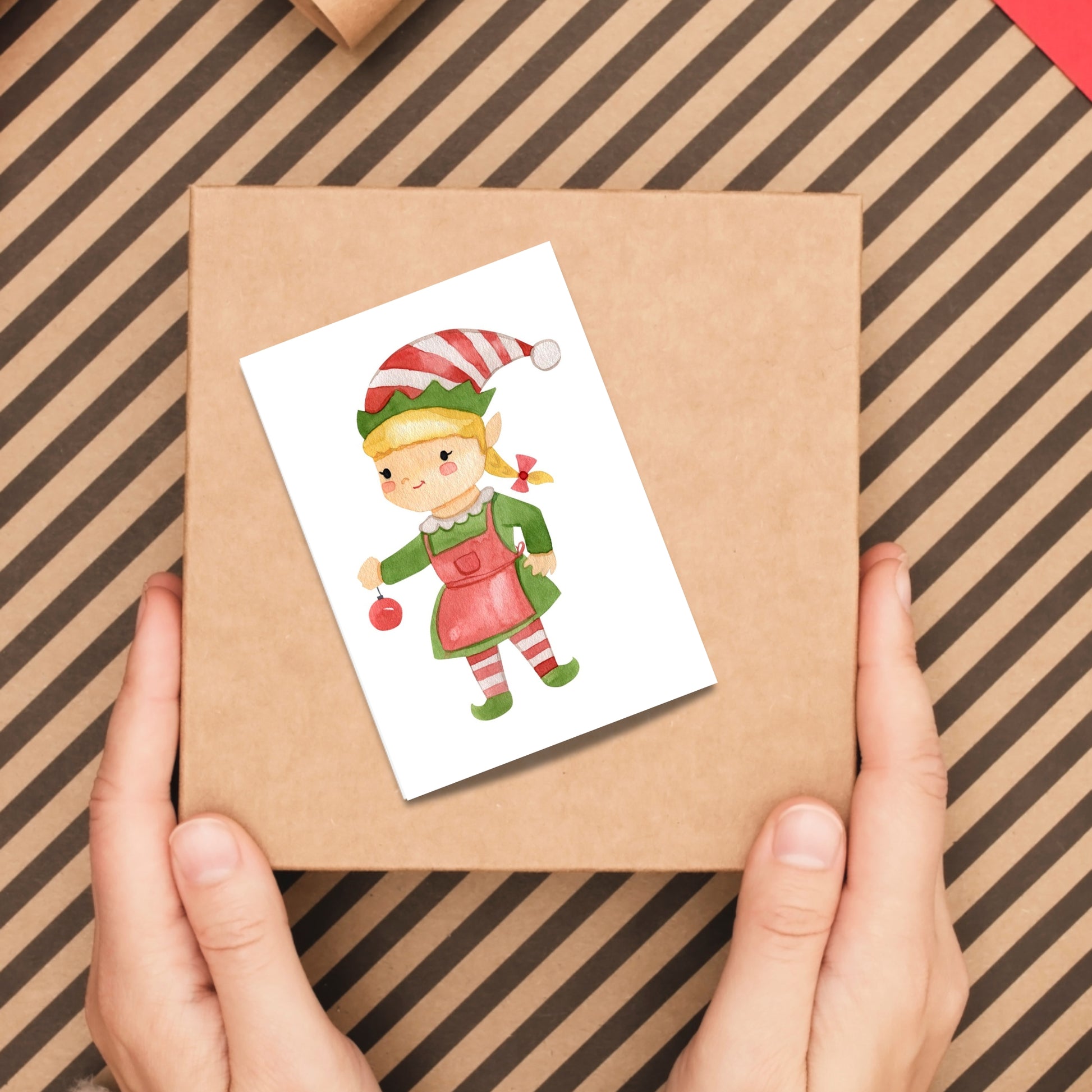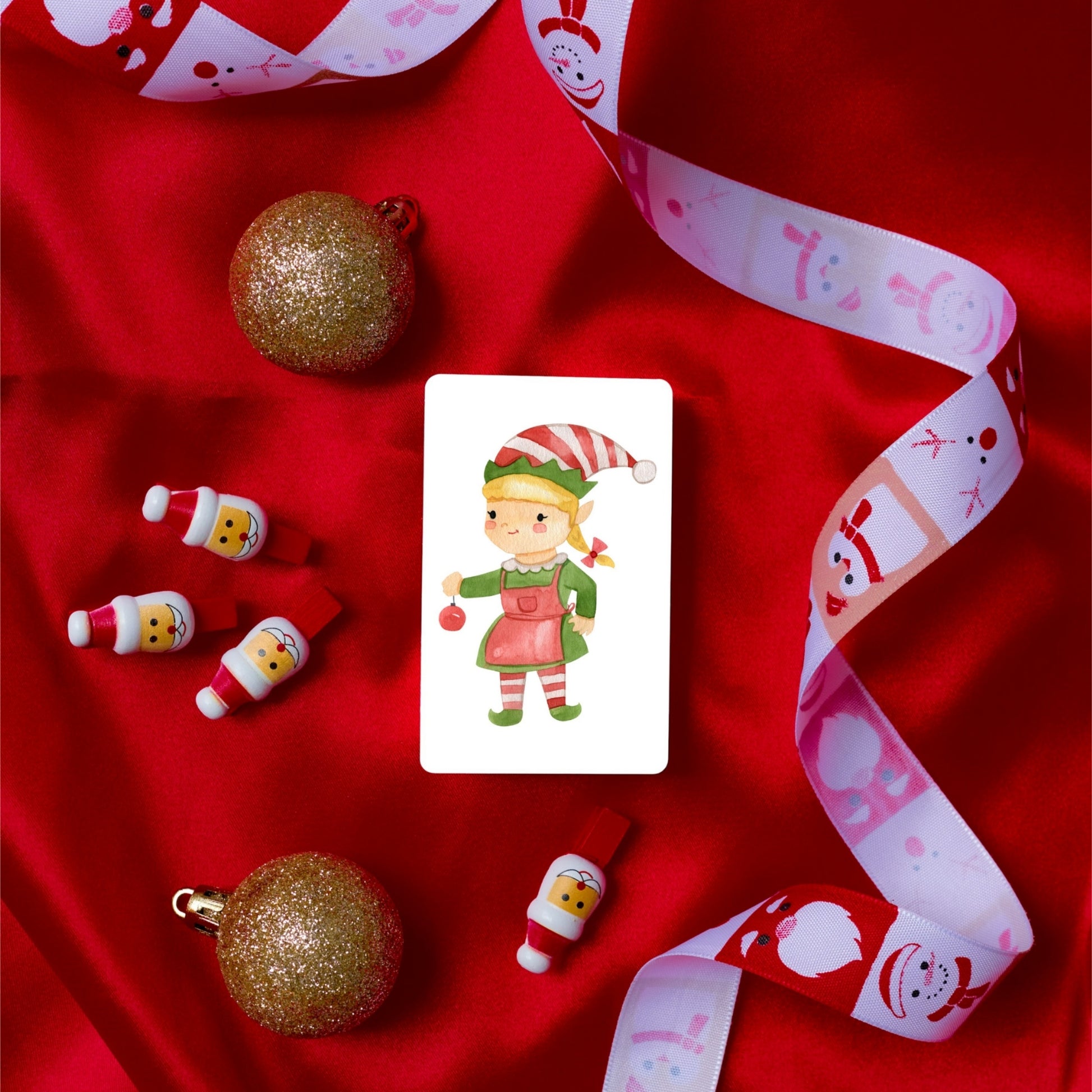 Liebevoll gestaltete Mini-Weihnachtskarte mit süßer Weihnachtselfin Illustration. Perfekt für kleine Weihnachtsgrüße, für den Adventskalender oder als Karte zum Weihnachtsgeschenk.
