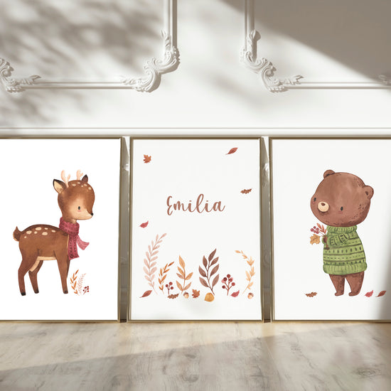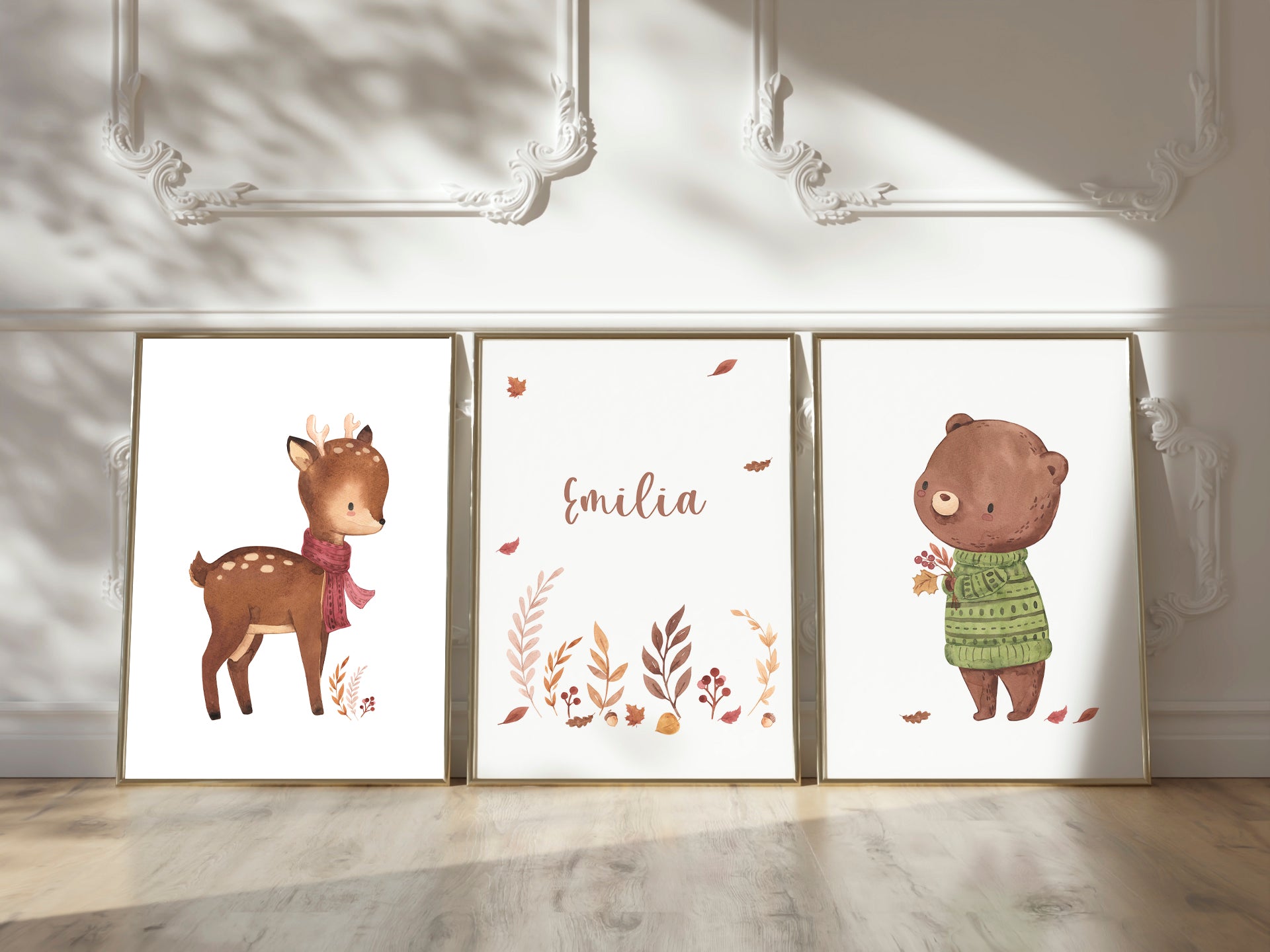 Dieses liebevoll gestaltete personalisierte Waldtiere 3er Poster Set bringt herbstlich, warme Stimmung ins Kinderzimmer und eignet sich perfekt als Wanddeko oder Geschenk zur Geburt, Taufe oder zum Geburtstag.