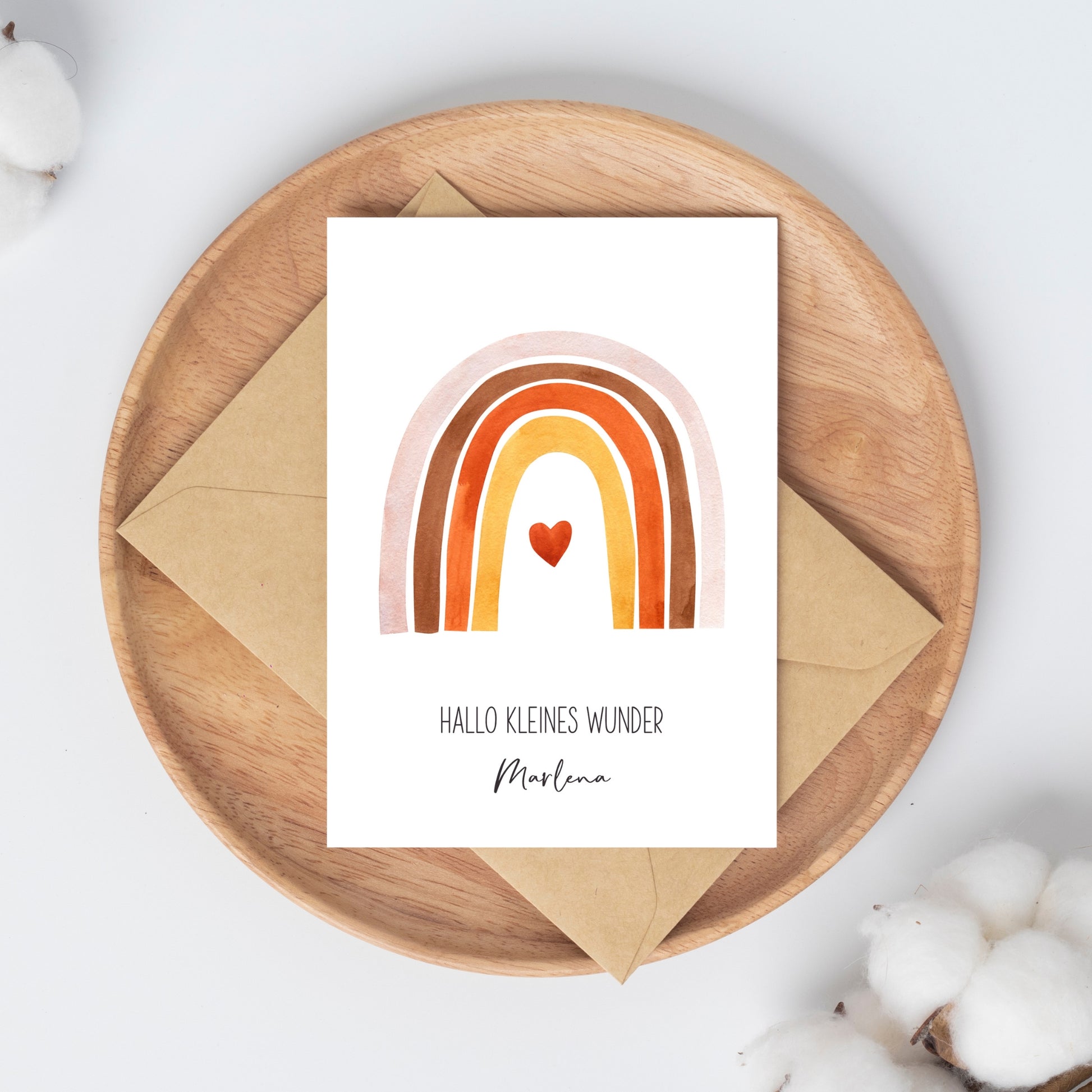 Liebevoll gestaltete Geburtskarte personalisiert mit Namen, mit Regenbogen und Herz im Boho Stil und ‚Willkommen auf der Welt‘ Schriftzug. Perfekt als fröhliche Glückwunschkarte zur Geburt, als Geschenk für das Baby oder um Das Regenbogenbaby willkommen zu heißen.