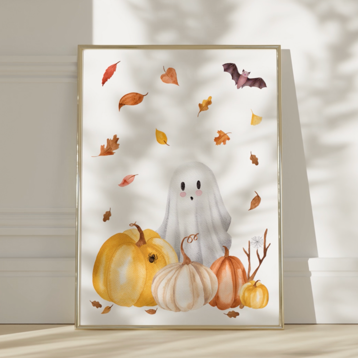 Dieses bezaubernde Poster mit dem süßen Halloweenmotiv mit Gespenst, Kürbissen, Fledermaus und Spinne zaubert garantiert jedem ein Schmunzeln auf die Lippen. Das Bild eignet sich als Kinderzimmerdeko oder als Geschenk zum Geburtstag, als Herbstdekoration oder als Deko für die Halloweenparty.