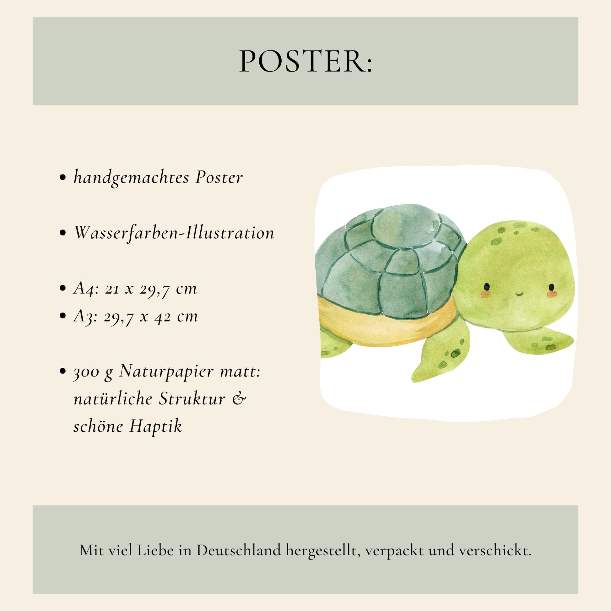 Dieses niedliche Schildkrötenposter bringt die Tierwelt ins Kinderzimmer. Es eignet sich als Kinderzimmerdeko, als Geschenk zum Geburtstag oder für Babys zur Geburt. Das Poster ist ideal für kleine Tierfreunde.