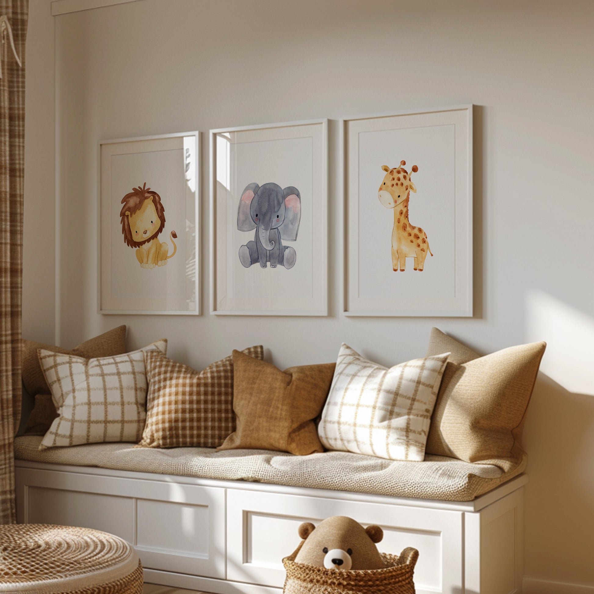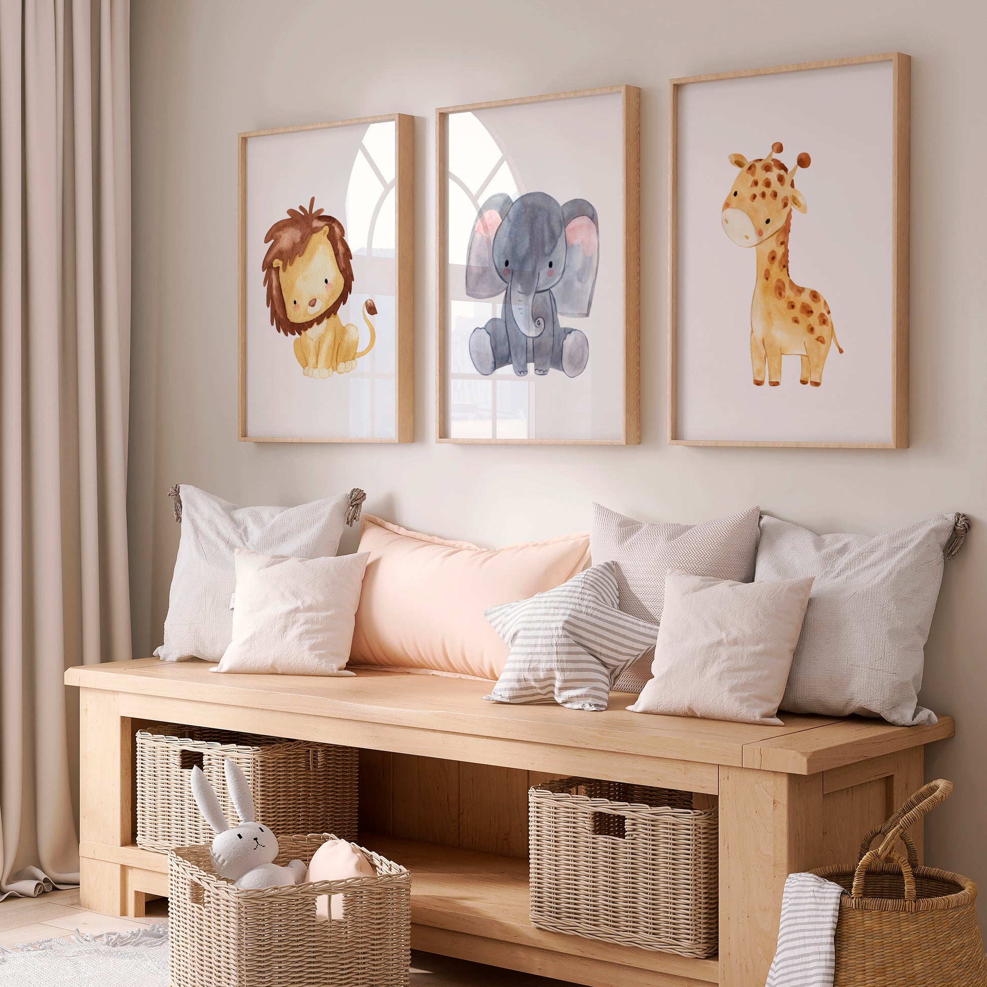 Dieses bezaubernde Posterset mit Löwe, Elefant und Giraffe bringt die Magie der afrikanischen Savanne direkt ins Kinderzimmer. Es eignet sich als Kinderzimmerdeko, als Geschenk zum Geburtstag oder für Babys zur Geburt. Die Kinderbilder sind ideal für kleine Entdecker.