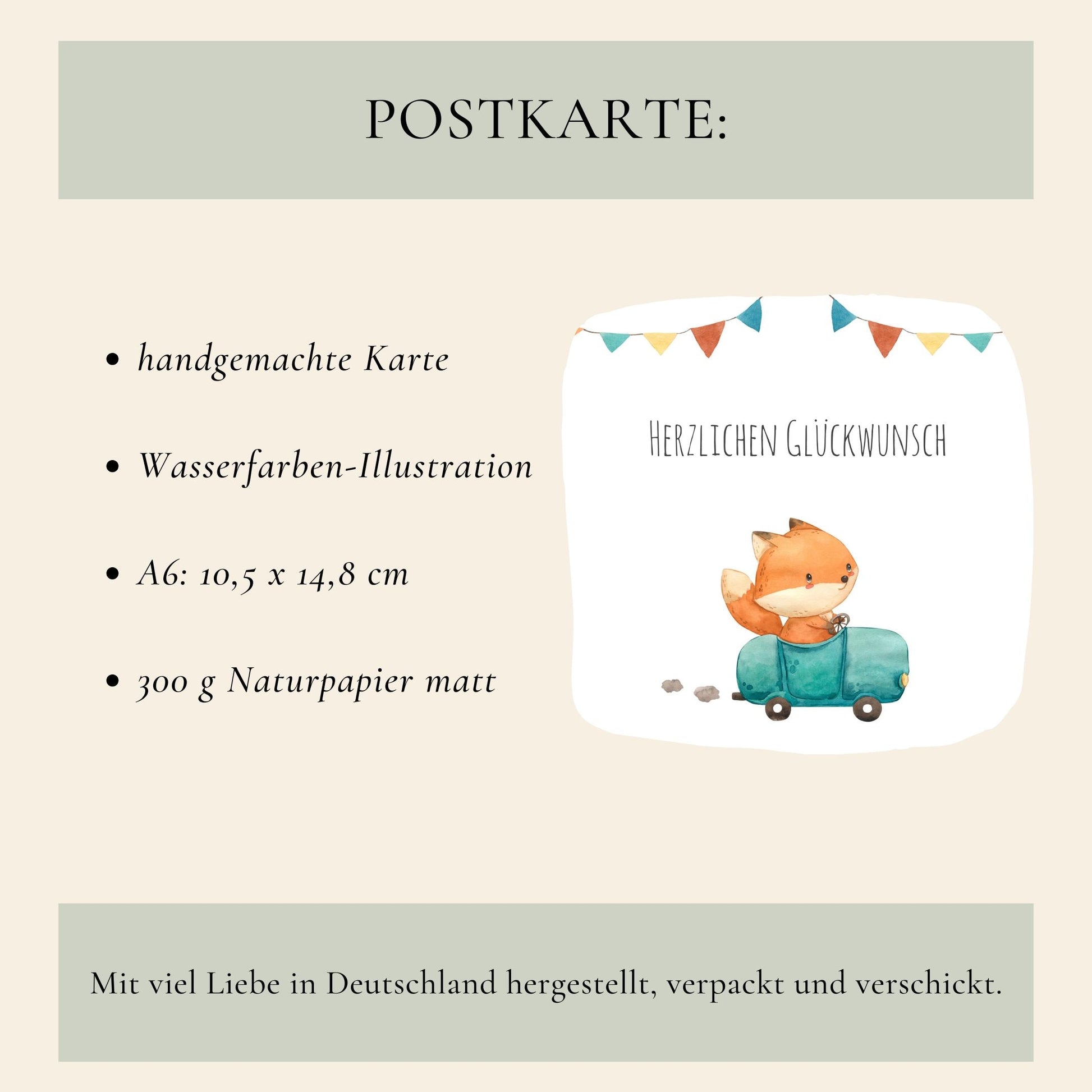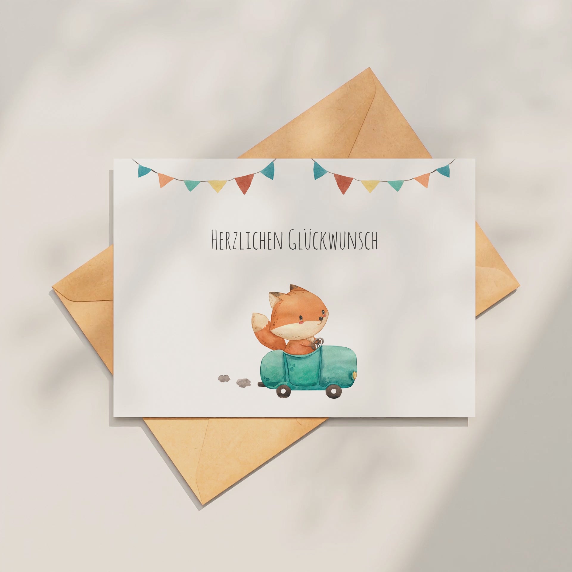 Liebevoll gestaltete Geburtstagskarte für Kinder mit dem niedlichen Fuchs in seinem Auto und 'Herzlichen Glückwunsch' Schriftzug. Diese handgefertigte Karte ist perfekt als Glückwunschkarte zum Kindergeburtstag für alle Geburtstagskinder, die Tiere lieben.