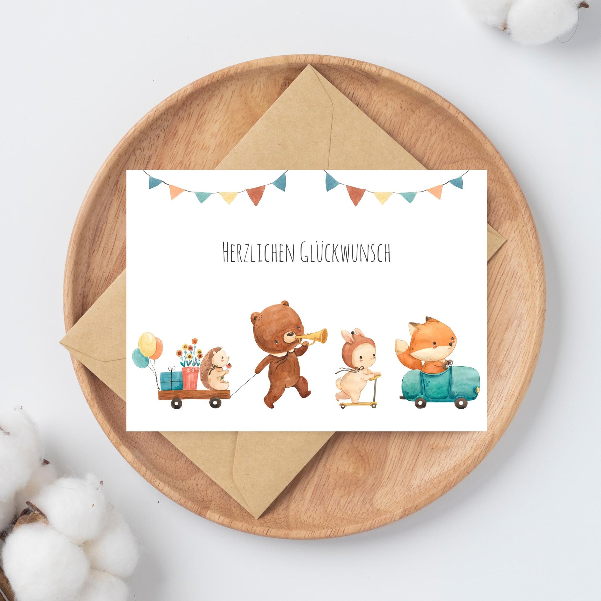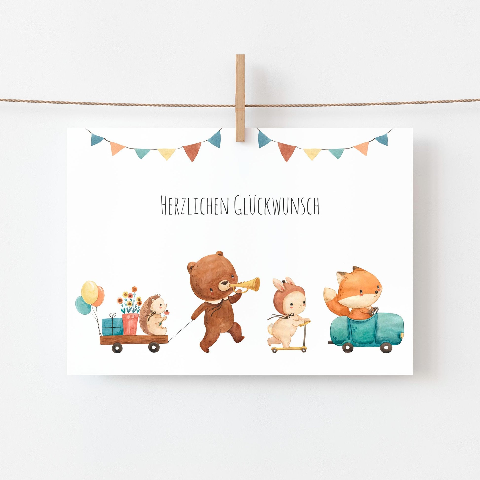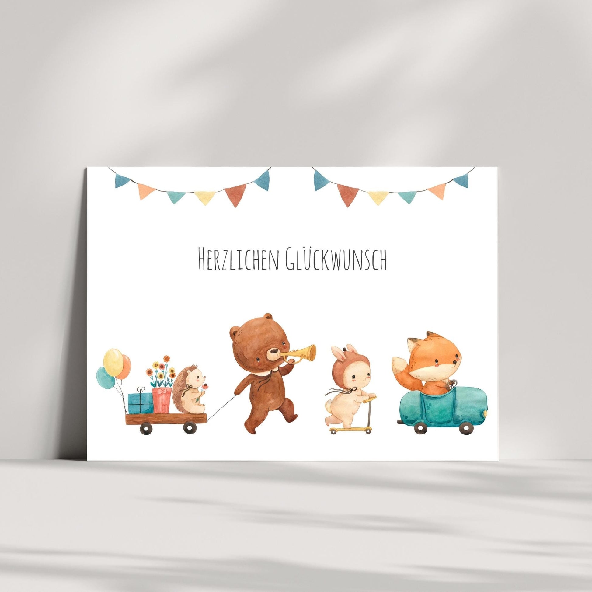 Liebevoll gestaltete Geburtstagskarte für Kinder mit niedlicher Tierparade mit Igel, Bär, Hase und Fuchs und 'Herzlichen Glückwunsch' Schriftzug. Diese handgefertigte Karte ist perfekt als Glückwunschkarte zum Kindergeburtstag für alle Geburtstagskinder, die Tiere lieben.