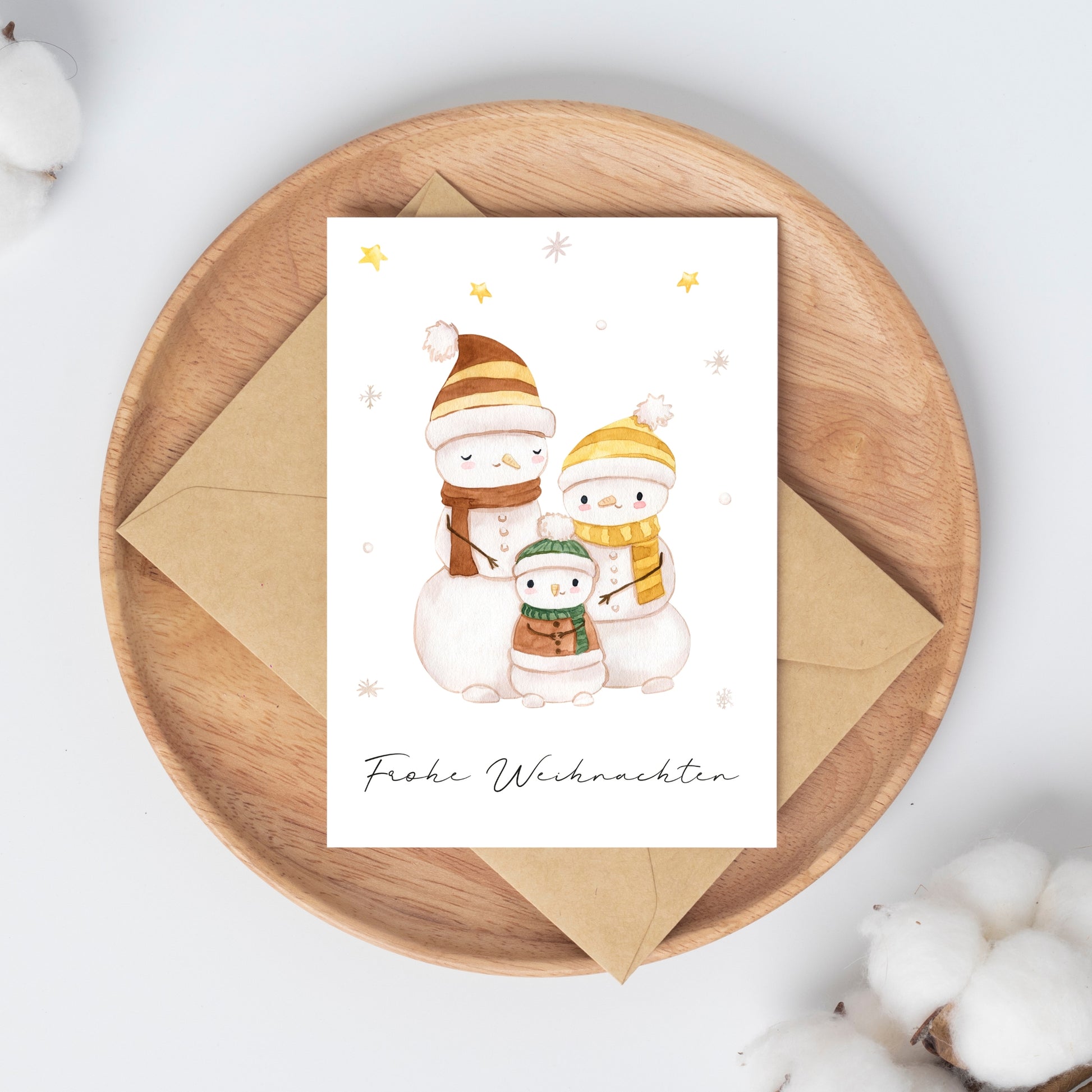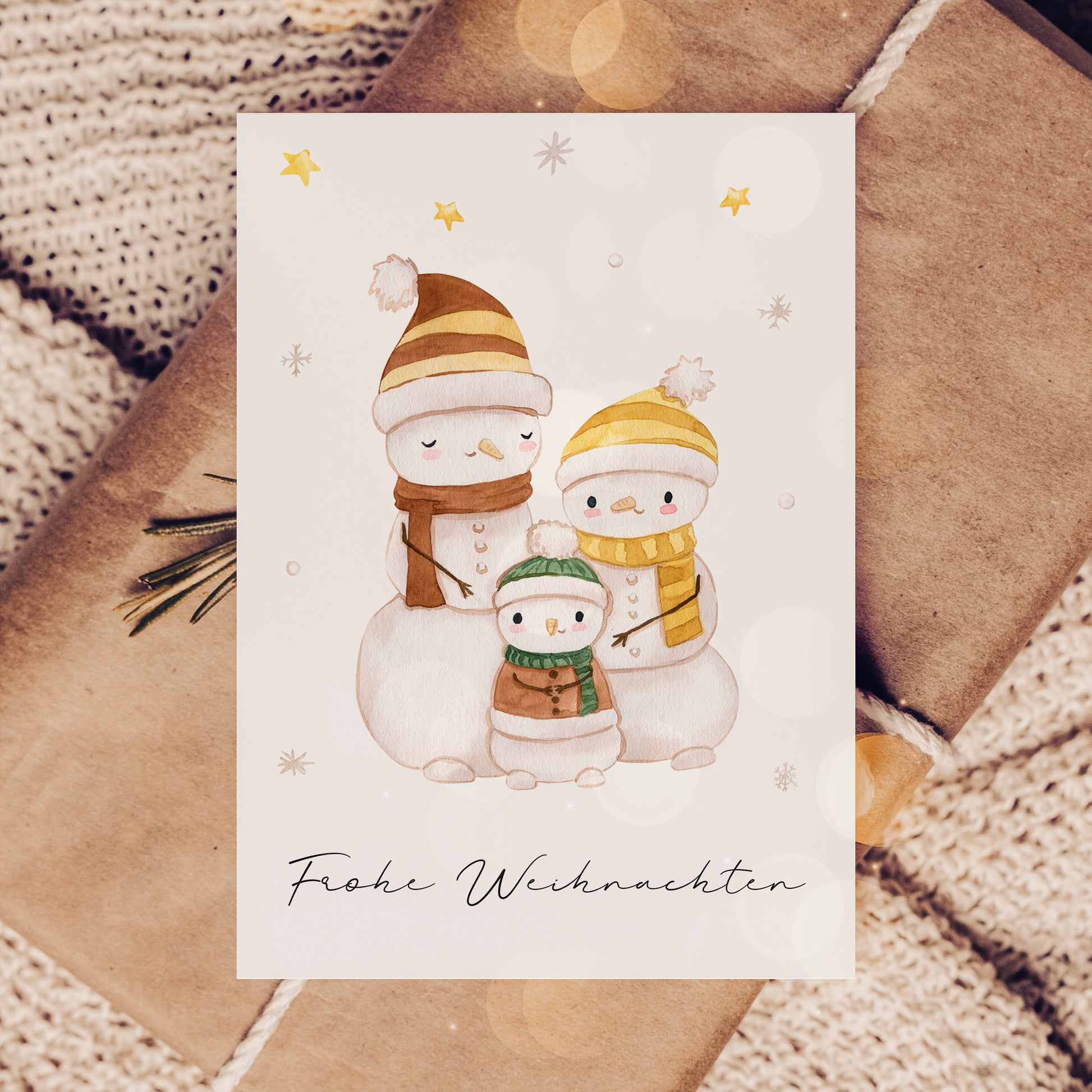 Liebevoll gestaltete Weihnachtskarte mit der süßen Schneemann Familie und "Frohe Weihnachten" Schriftzug. Perfekt für liebe Weihnachtsgrüße, als Karte zum Weihnachtsgeschenk oder gerahmt als Weihnachtsdekoration.