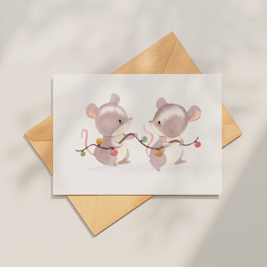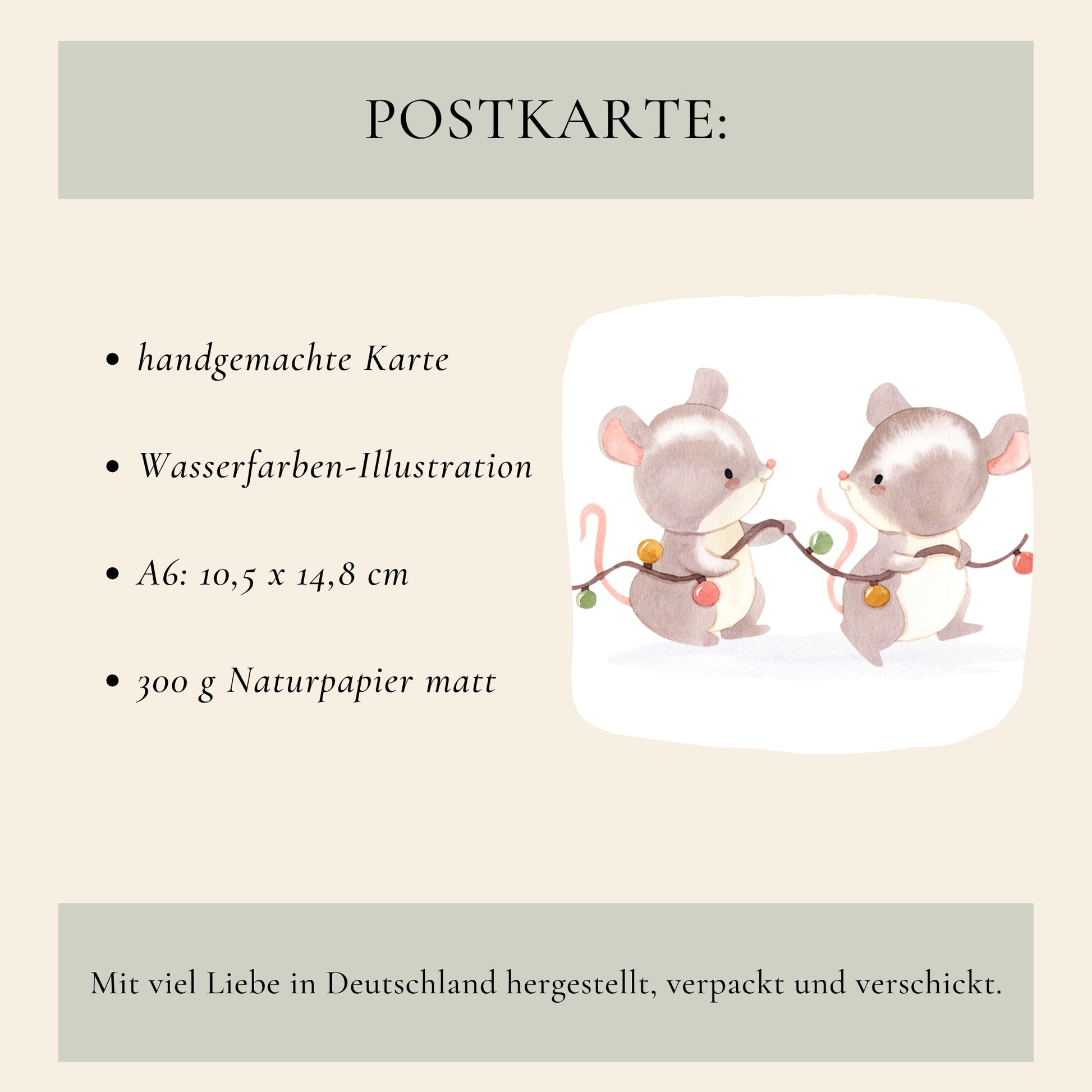 Liebevoll gestaltete Weihnachtskarte mit süßer, weihnachtlicher Illustration mit den niedlichen Mäusen und ihrer Lichterkette. Perfekt für liebe Weihnachtsgrüße, als Karte zum Weihnachtsgeschenk oder gerahmt als Weihnachtsdekoration.