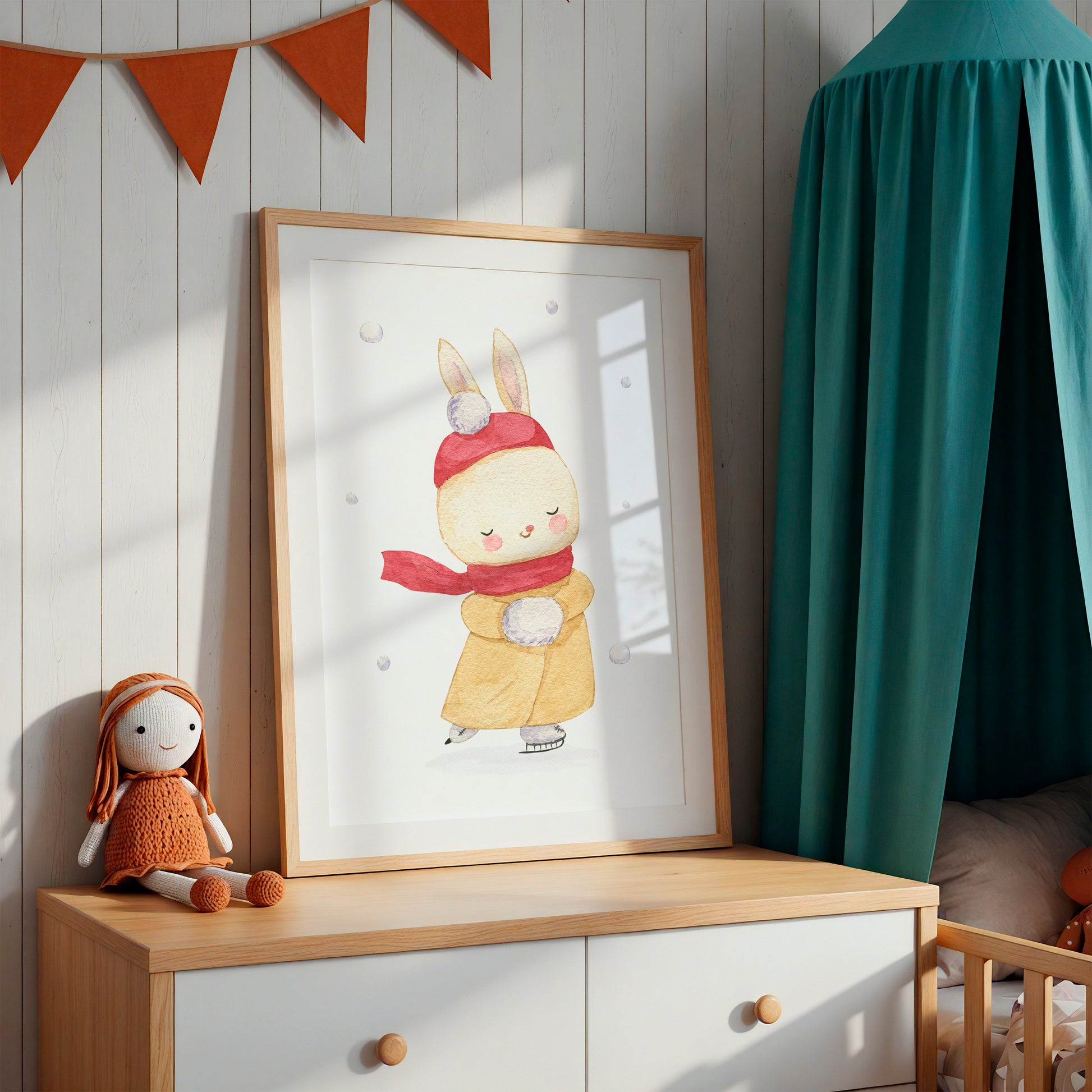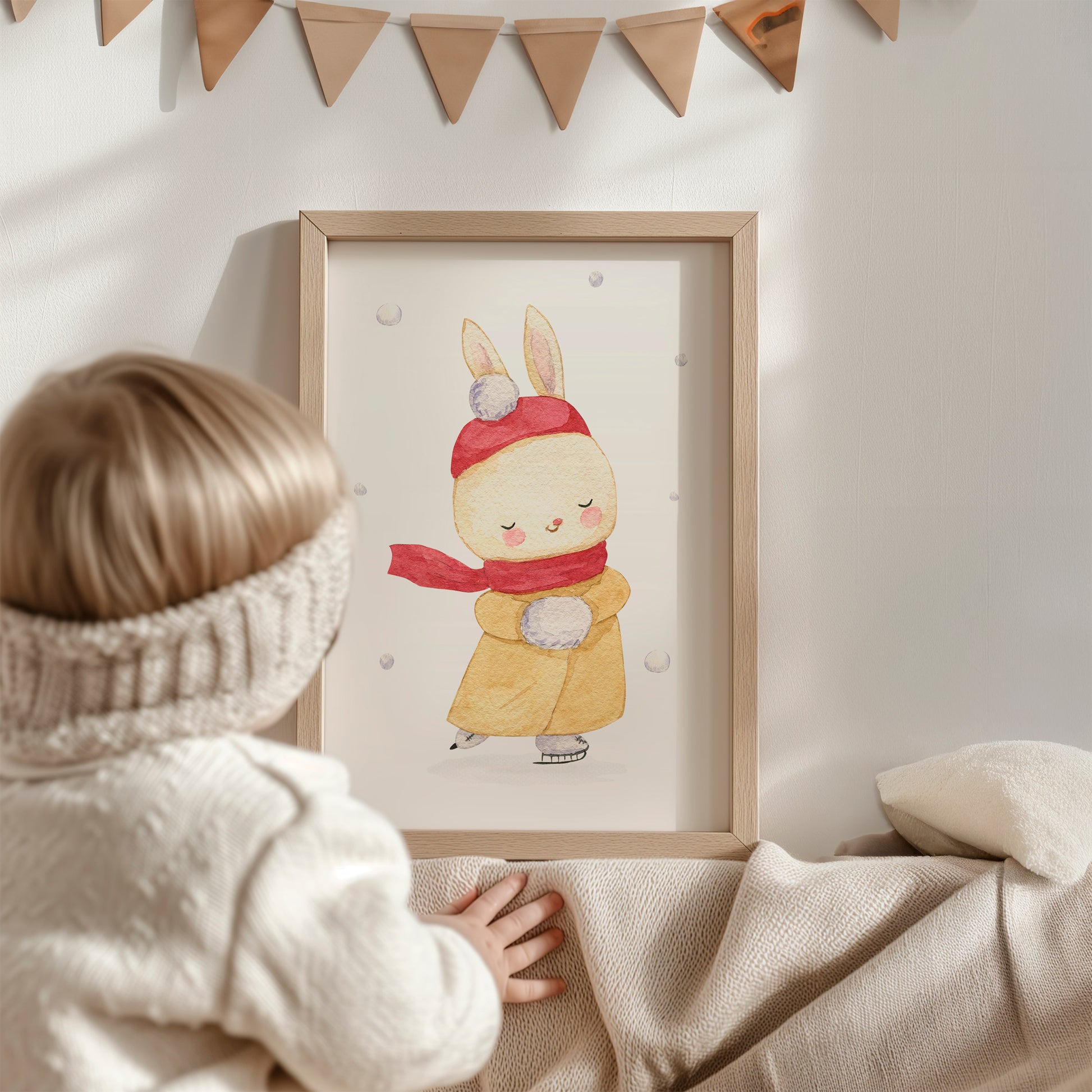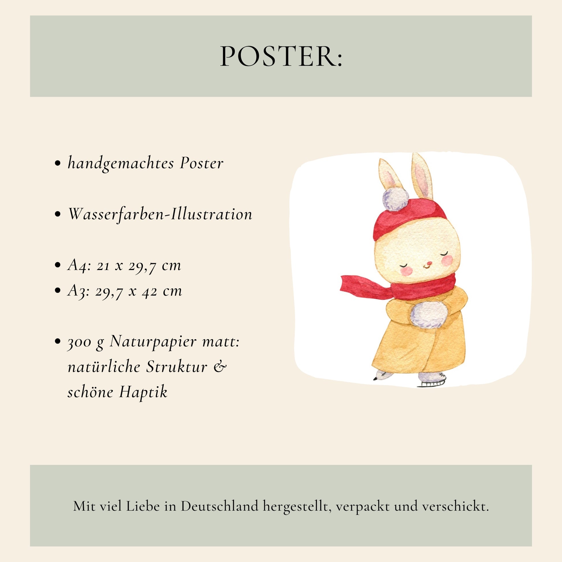 Dieses handgemalte Poster mit der niedlichen Häsin auf Schlittschuhen bringt Winterstimmung ins Kinderzimmer. Es eignet sich als Kinderzimmerdeko oder als Geschenk. Das Kinderbild ist ideal als Weihnachtsdekoration und zaubert garantiert ein Lächeln auf die Lippen.