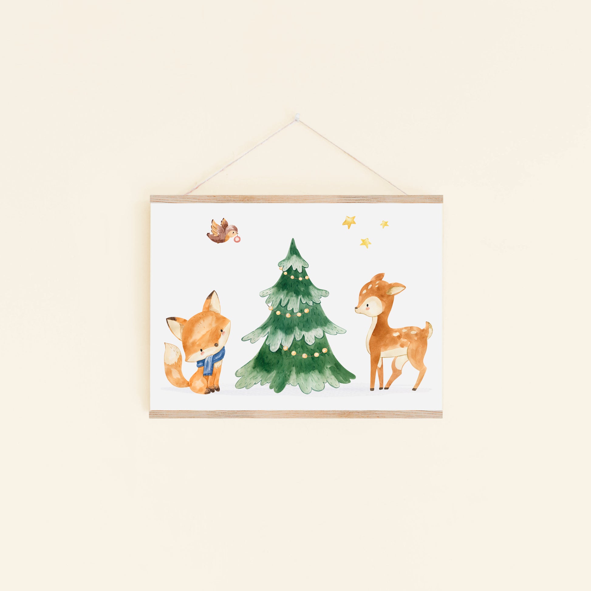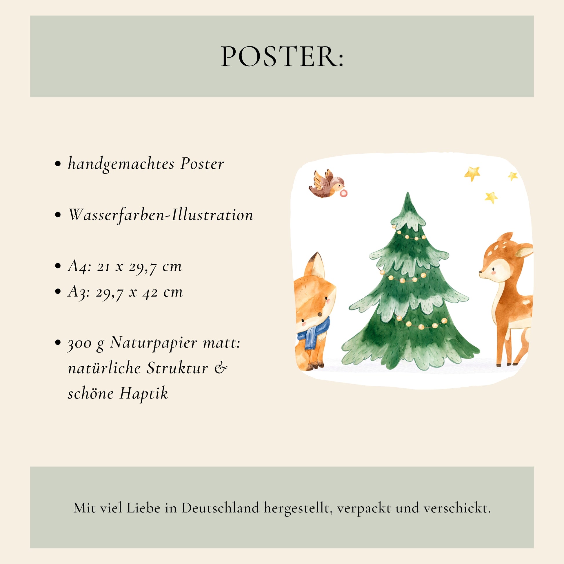 Dieses handgemalte Poster mit den niedlichen Waldtieren Fuchs, Reh und Vogel unterm Weihnachtsbaum bringt weihnachtliche Stimmung ins Kinderzimmer. Es eignet sich als Kinderzimmerdeko oder als Geschenk. Das Kinderbild ist ideal als Weihnachtsdekoration und zaubert garantiert ein Lächeln auf die Lippen.